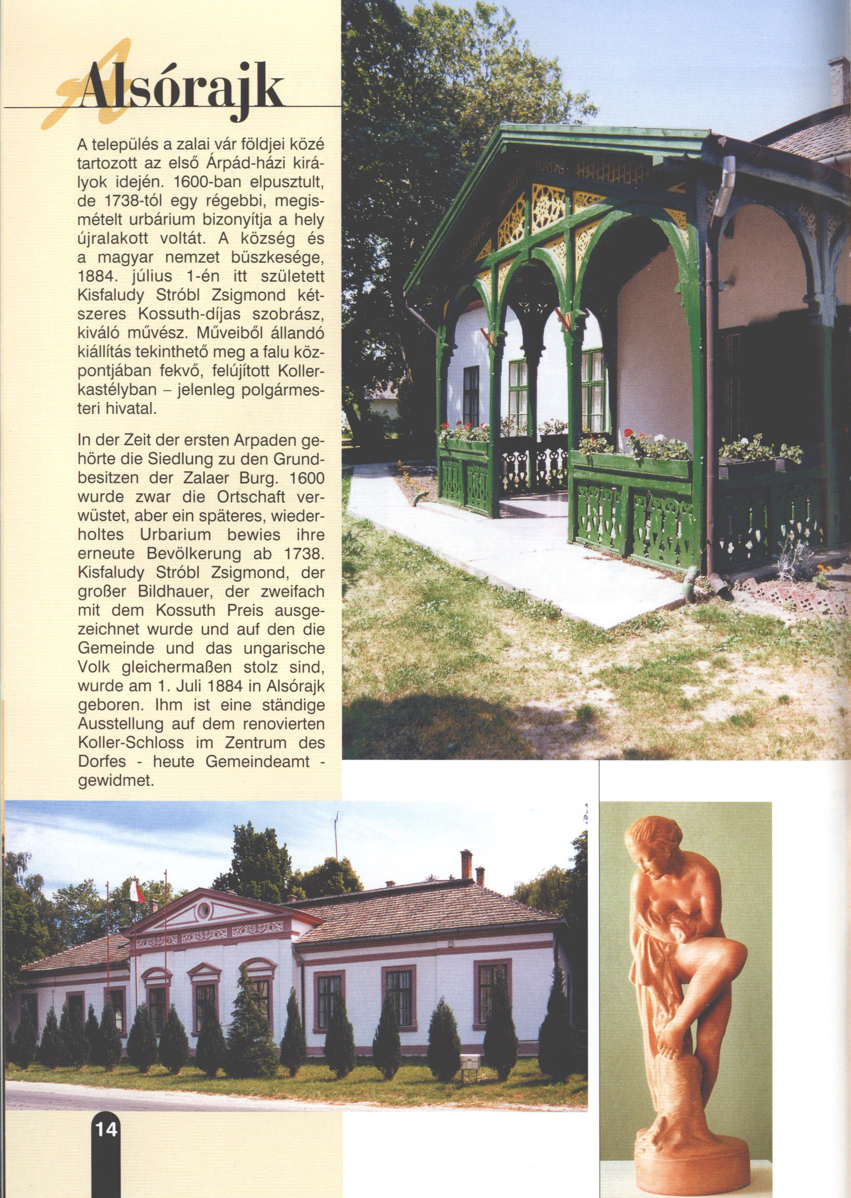Nyilvános 2108 | 6127 | Rövid leírás | Teljes leírás (1.21 KB) | Alsórajk In der Zeit der ersten Arpaden gehörte die Siedlung zu den Grundbesitzen der Zalaer Burg. 1600 wurde zwar die Ortschaft verwüstet, aber ein späteres, wiederholtes Urbarium bewies ihre erneute Bevölkerung ab 1738. Kisfaludy Stróbl Zsigmond, der großer Bildhauer, der zweifach mit dem Kossuth Preis ausgezeichnet wurde und auf den die Gemeinde und das ungarische Volk gleichermaßen stolz sind, wurde am 1. Juli 1884 in Alsórajk geboren. Ihm ist eine ständige Ausstellung auf dem renovierten Koller-Schloss im Zentrum des Dorfes - heute Gemeindeamt -gewidmet. Dieses Text stammt von: Titel: Hívogató a Régiók Kapujában - Útikönyv Látnivalók Nagykanizsán és Térségében (Einladend in dem Tor des Gebiets - Reisebuch - Sehenswürdigkeiten in Nagykanizsa und Umgebung) Herausgegeben von: Nagykanizsa és a Környező Települések Területfejlesztési Társulása (Verein für Gebietsentwicklung in Nagykanizsa und in ihrer Umgebung) 8800 Nagykanizsa, Petőfi Sándor út 5. Tel.: 06 93/536-453 • 06 93/536-454 Tel ./Fax: 06 93/326-323 E-mail: terstars@axelero.hu www.kanizsaterseg.celodin.hu |