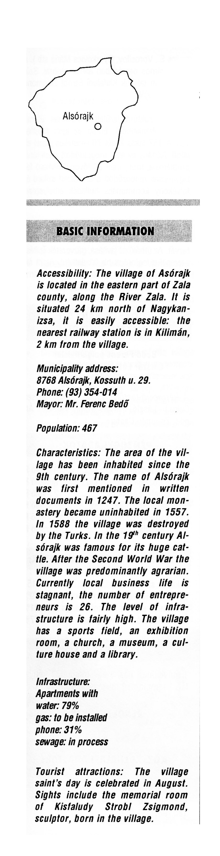 Nyilvános 2042 | 6068 | Alsórajk | BASIC INFORMATION Accessibility: The village of Alsórajk is located in the eastern part of Zala county, along the River Zala. It is situated 24 km north of Nagykanizsa, it is easily accessible: the nearest railway station is in Kilimán, 2 km from the village. Municipality address: 8768 Alsórajk, Kossuth u. 29. Phone: (93) 354-014 Mayor: Mr. Ferenc Bedő Population: 467 Characteristics: The area of the village has been inhabited since the 9th century. The name of Alsórajk was first mentioned in written documents in 1247. The local monastery became uninhabited in 1557. In 1588 the village was destroyed by the Turks. In the 19th century Alsórajk was famous for its huge cattle. After the Second World War the village was predominantly agrarian. Currently local business life is stagnant, the number of entrepreneurs is 26. The level of infrastructure is fairly high. The village has a sports field, an exhibition room, a church, a museum, a culture house and a library. Infrastructure: Apartments with water: 79% gas: to be installed phone: 31% sewage: in process Tourist attractions: The village saint's day is celebrated in August. Sights include the memorial room of Kisfaludy Strobl Zsigmond, sculptor, born in the village. This text came from the following book: Title: Handbook of Zala county (Zala megye kézikönyve) Series: County handbooks of Hungary (Magyarország megyei kézikönyvei) Chief editor: Hóbor József Publisher: (Hatvan), CEBA-Hungary Ltd, 1998 ETO: 908.439.121(035) ; 050.8(439.121) ISBN: 963-9089-18-2 Pages: 488-1040 p. Remark: Closed on: 1998. márc. 31. |
