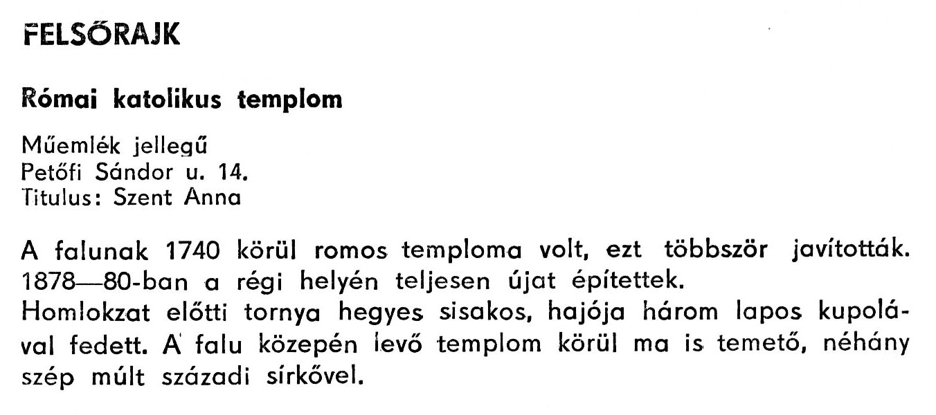 Nyilvános 2072 | 4255 | Felsőrajk - Zala megye műemlékei 1979 068old | A részlet szövege: FELSŐRAJK Római katolikus templom Műemlék jellegű Petőfi Sándor u. 14. Titulus: Szent Anna A falunak 1740 körül romos temploma volt, ezt többször javították. 1878–80-ban a régi helyén teljesen újat építettek. Homlokzat előtti tornya hegyes sisakos, hajója három lapos kupolával fedett. A falu közepén levő templom körül ma is temető, néhány szép múlt századi sírkővel. A részlet a következő könyvből származik: Cím: Zala megye műemlékei Szerző: Németh József (1928) Közreműködő: Vándor László (szerk.) ; Szabóky Zsolt (1941) (fotó) Szerz. közl.: Németh József ; [szerk. Vándor László] ; [fotók... Szabóky Zsolt] Kiadás jelzés: 2. bőv. kiad. Kiadás: Zalaegerszeg : Zalai Ny., 1979 ETO jelzet: 72(439.121) ; 7.025.3/.4(439.121) ; 908.439.121 Tárgyszó: Zala Szakjelzet: 908 Cutter: N 53 Nyelv: magyar Oldalszám: 134 p. |