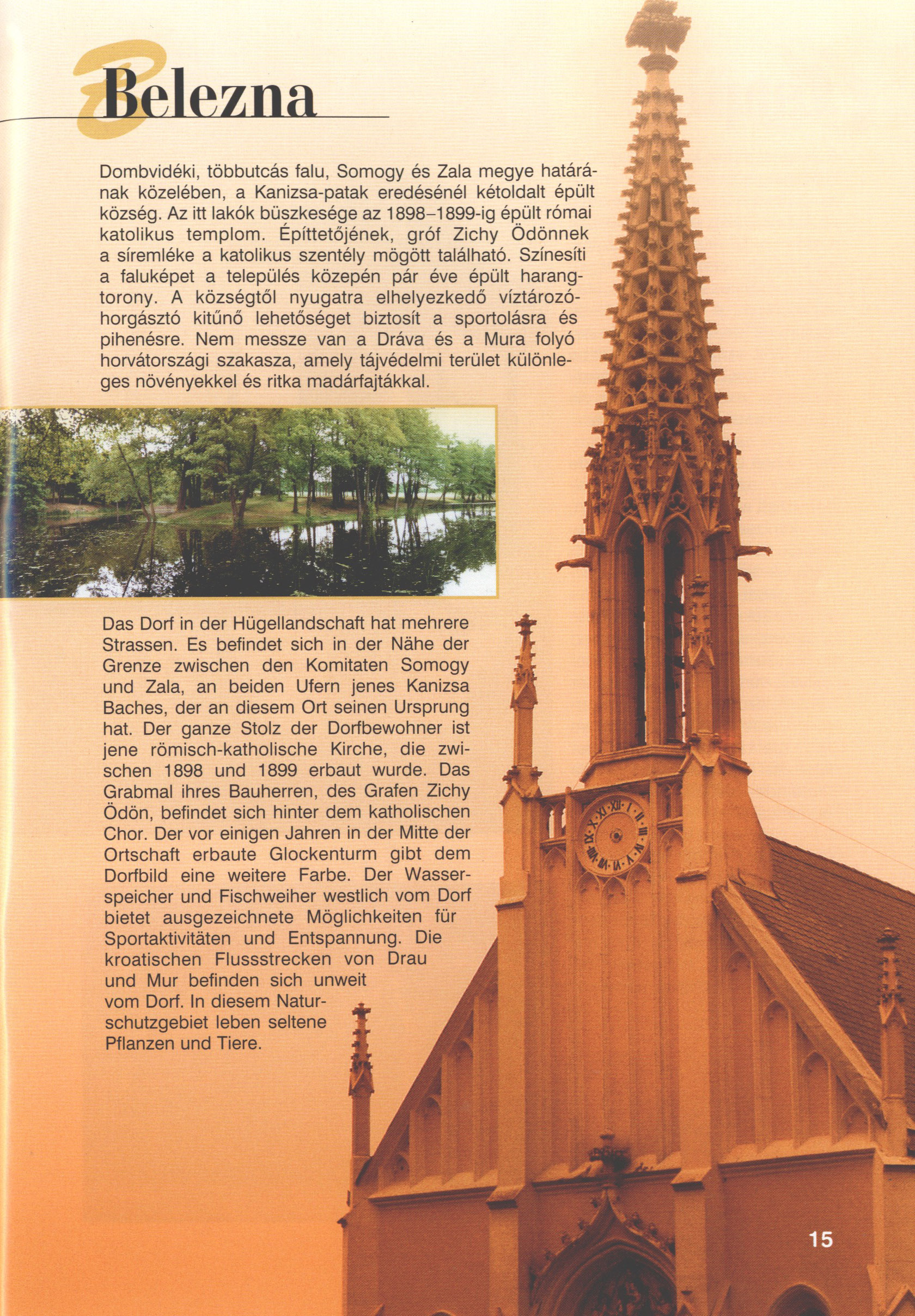 Nyilvános 2400 | 7746 | Rövid leírás | Teljes leírás (1.43 KB) | Belezna Das Dorf in der Hügellandschaft hat mehrere Strassen. Es befindet sich in der Nähe der Grenze zwischen den Komitaten Somogy und Zala, an beiden Ufern jenes Kanizsa Baches, der an diesem Ort seinen Ursprung hat. Der ganze Stolz der Dorfbewohner ist jene römisch-katholische Kirche, die zwischen 1898 und 1899 erbaut wurde. Das Grabmal ihres Bauherren, des Grafen Zichy Ödön, befindet sich hinter dem katholischen Chor. Der vor einigen Jahren in der Mitte der Ortschaft erbaute Glockenturm gibt dem Dorfbild eine weitere Farbe. Der Wasserspeicher und Fischweiher westlich vom Dorf bietet ausgezeichnete Möglichkeiten für Sportaktivitäten und Entspannung. Die kroatischen Flussstrecken von Drau und Mur befinden sich unweit vom Dorf. In diesem Naturschutzgebiet leben seltene Pflanzen und Tiere. Dieses Text stammt von: Titel: Hívogató a Régiók Kapujában - Útikönyv Látnivalók Nagykanizsán és Térségében (Einladend in dem Tor des Gebiets - Reisebuch - Sehenswürdigkeiten in Nagykanizsa und Umgebung) Herausgegeben von: Nagykanizsa és a Környező Települések Területfejlesztési Társulása (Verein für Gebietsentwicklung in Nagykanizsa und in ihrer Umgebung) 8800 Nagykanizsa, Petőfi Sándor út 5. Tel.: 06 93/536-453 • 06 93/536-454 Tel ./Fax: 06 93/326-323 E-mail: terstars@axelero.hu www.kanizsaterseg.celodin.hu |