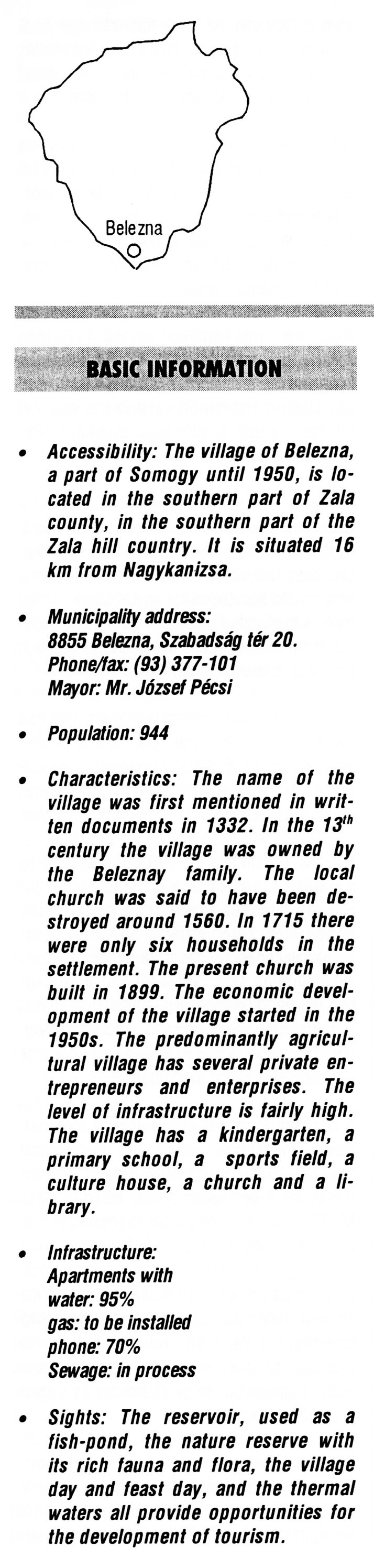 Nyilvános 2296 | 6721 | Rövid leírás | Teljes leírás (1.79 KB) | Belezna BASIC INFORMATION • Accessibility: The village of Belezna, a part of Somogy until 1950, is located in the southern part of Zala county, in the southern part of the Zala hill country. It is situated 16 km from Nagykanizsa. • Municipality address: 8855 Belezna, Szabadság tér 20. Phone/fax: (93) 377-101 Mayor: Mr. József Pécsi • Population: 944 • Characteristics: The name of the village was first mentioned in written documents in 1332. In the 13th century the village was owned by the Beleznay family. The local church was said to have been destroyed around 1560. In 1715 there were only six households in the settlement. The present church was built in 1899. The economic development of the village started in the 1950s. The predominantly agricultural village has several private entrepreneurs and enterprises. The level of infrastructure is fairly high. The village has a kindergarten, a primary school, a sports field, a culture house, a church and a library. • Infrastructure: Apartments with water: 95% gas: to be installed phone: 70% Sewage: in process • Sights: The reservoir, used as a fish-pond, the nature reserve with its rich fauna and flora, the village day and feast day, and the thermal waters all provide opportunities for the development of tourism. This text came from the following book: Title: Handbook of Zala county (Zala megye kézikönyve) Series: County handbooks of Hungary (Magyarország megyei kézikönyvei) Chief editor: Hóbor József Publisher: (Hatvan), CEBA-Hungary Ltd, 1998 ETO: 908.439.121(035) ; 050.8(439.121) ISBN: 963-9089-18-2 Pages: 488-1040 p. Remark: Closed on: 1998. márc. 31. |
