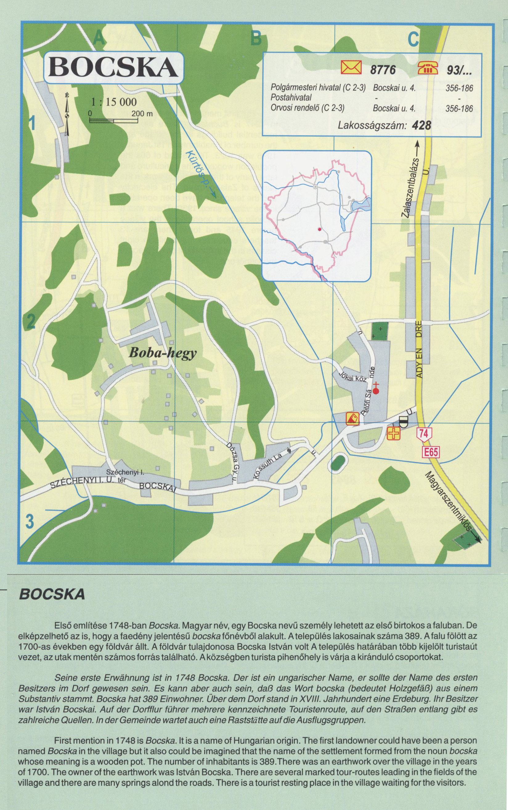 Nyilvános 2440 | 9484 | BOCSKA | Első említése 1748-ban Bocska. Magyar név, egy Bocska nevű személy lehetett az első birtokos a faluban. De elképzelhető az is, hogy a faedény jelentésű bocska főnévből alakult. A település lakosainak száma 389.A falu fölött az 1700-as években egy földvár állt. A földvár tulajdonosa Bocska István volt A település határában több kijelölt turistaút vezet, az utak mentén számos forrás található. A községben turista pihenőhely is várja a kiránduló csoportokat. Seine erste Erwähnung ist in 1748 Bocska. Der ist ein ungarischer Name, er sollte der Name des ersten Besitzers im Dorf gewesen sein. Es kann aber auch sein, daß das Wort bocska (bedeutet Holzgefäß) aus einem Substantiv stammt. Bocska hat 389 Einwohner. Über dem Dorfstand in XVIII. Jahrhundert eine Erdeburg. Ihr Besitzer war István Bocskai. Auf der Dorfflur führer mehrere kennzeichnete Touristenroute, auf den Straßen entlang gibt es zahlreiche Quellen. In der Gemeinde wartet auch eine Raststätte auf die Ausflugsgruppen. First mention in 1748 is Bocska. It is a name of Hungarian origin. The first landowner could have been a person named Bocska in the village but it also could be imagined that the name of the settlement formed from the noun bocska whose meaning is a wooden pot. The number of inhabitants is 389.There was an earthwork over the village in the years of 1700. The owner of the earthwork was István Bocska. There are several marked tour-routes leading in the fields of the village and there are many springs alond the roads. There is a tourist resting place in the village waiting forthe visitors. A részlet a következő kiadványból származik/Die Teile stammen vom volgenden Buch/This text came from the following book: Cím/Titel/Title: Zala megye településeinek atlasza - 257 település részletes térképe/Atlas der Komitat Zala - 257 Detailte Siedlungskarten/Zala county\'s Atlas - 257 settlement maps. Közreműködő/contributor: Lackner László (1943) (fotó) Kiadás/Ausgabe/Publisher: Gyula : HISZI-MAP, 1997 Sorozat/Serie/Series: Indulástól - megérkezésig... ETO: 912(439.121-2) ; 908.439.121 Cutter: Z 19 ISBN: 963-610-025-4 Oldalszám/Seiten/Pages: 323, 81 p. Megjegyzés/Note: Lezárva/Abgeschlossen am/Closed am: 1997. máj. 30. |