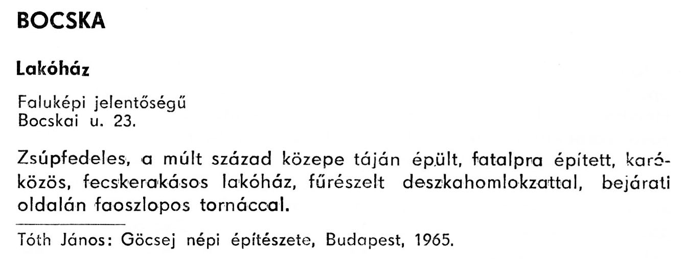 Nyilvános 2218 | 6039 | Bocska - Zala megye műemlékei 1979 058old | A részlet szövege: BOCSKA Lakóház Faluképi jelentőségű Bocskai u. 23. Zsúpfedeles, a múlt század közepe táján épült, fatalpra épített, karóközös, fecskerakásos lakóház, fűrészelt deszkahomlokzattal, bejárati oldalán faoszlopos tornáccal. Tóth János: Göcsej népi építészete, Budapest, 1965. A részlet a következő könyvből származik: Cím: Zala megye műemlékei Szerző: Németh József (1928) Közreműködő: Vándor László (szerk.) ; Szabóky Zsolt (1941) (fotó) Szerz. közl.: Németh József ; [szerk. Vándor László] ; [fotók... Szabóky Zsolt] Kiadás jelzés: 2. bőv. kiad. Kiadás: Zalaegerszeg : Zalai Ny., 1979 ETO jelzet: 72(439.121) ; 7.025.3/.4(439.121) ; 908.439.121 Tárgyszó: Zala Szakjelzet: 908 Cutter: N 53 Nyelv: magyar Oldalszám: 134 p. |