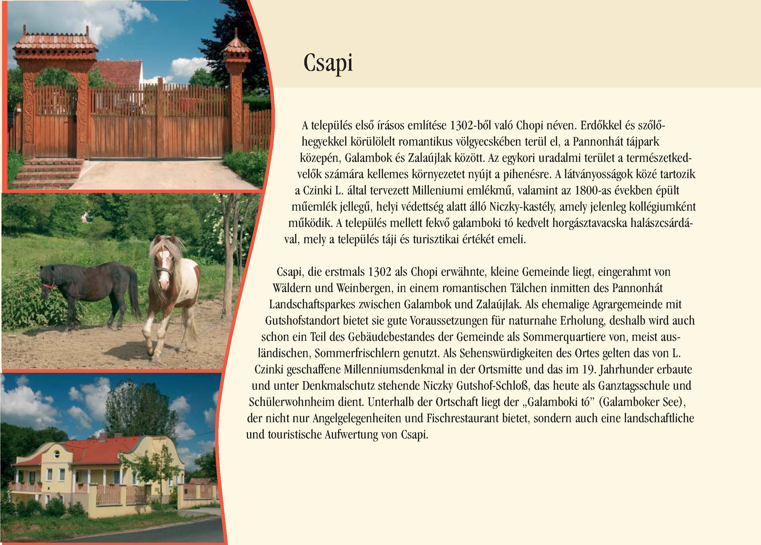 Nyilvános 2485 | 8682 | Csapi | Csapi, die erstmals 1302 als Chopi erwähnte, kleine Gemeinde liegt, eingerahmt von Wäldern und Weinbergen, in einem romantischen Tälchen inmitten des Pannonhát Landschaftsparkes zwischen Galambok und Zalaújlak. Als ehemalige Agrargemeinde mit Gutshofstandort bietet sie gute Voraussetzungen für naturnahe Erholung, deshalb wird auch schon ein Teil des Gebäudebestandes der Gemeinde als Sommerquartiere von, meist ausländischen, Sommerfrischlern genutzt. Als Sehenswürdigkeiten des Ortes gelten das von L. Czinki geschaffene Millenniumsdenkmal in der Ortsmitte und das im 19. Jahrhunder erbaute und unter Denkmalschutz stehende Niczky Gutshof-Schloß, das heute als Ganztagsschule und Schülerwohnheim dient. Unterhalb der Ortschaft liegt der ,,Galamboki tó" (Galamboker See), der nicht nur Angelgelegenheiten und Fischrestaurant bietet, sondern auch eine landschaftliche und touristische Aufwertung von Csapi. Dieses Text stammt von: Pannonhát tájpark prospektus 2006. Web: http://www.pannonhat.hu/ (auch in Deutsch) |