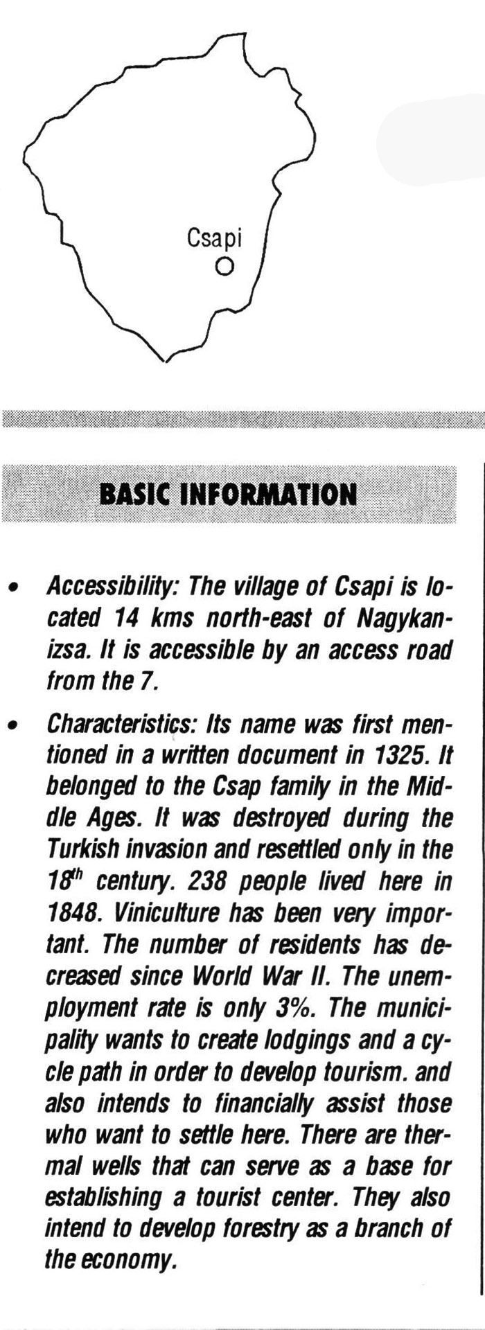 Nyilvános 2306 | 7813 | Csapi | BASIC INFORMATION • Accessibility: The village of Csapi is located 14 kms north-east of Nagykanizsa. It is accessible by an access road from the 7. • Characteristics: Its name was first mentioned in a written document in 1325. It belonged to the Csap family in the Middle Ages. It was destroyed during the Turkish invasion and resettled only in the 18th century. 238 people lived here in 1848. Viniculture has been very important. The number of residents has decreased since World War II. The unemployment rate is only 3%. The municipality wants to create lodgings and a cycle path in order to develop tourism, and also intends to financially assist those who want to settle here. There are thermal wells that can serve as a base for establishing a tourist center. They also intend to develop forestry as a branch of the economy. This text came from the following book: Title: Handbook of Zala county (Zala megye kézikönyve) Series: County handbooks of Hungary (Magyarország megyei kézikönyvei) Chief editor: Hóbor József Publisher: (Hatvan), CEBA-Hungary Ltd, 1998 ETO: 908.439.121(035) ; 050.8(439.121) ISBN: 963-9089-18-2 Pages: 488-1040 p. Remark: Closed on: 1998. márc. 31. |