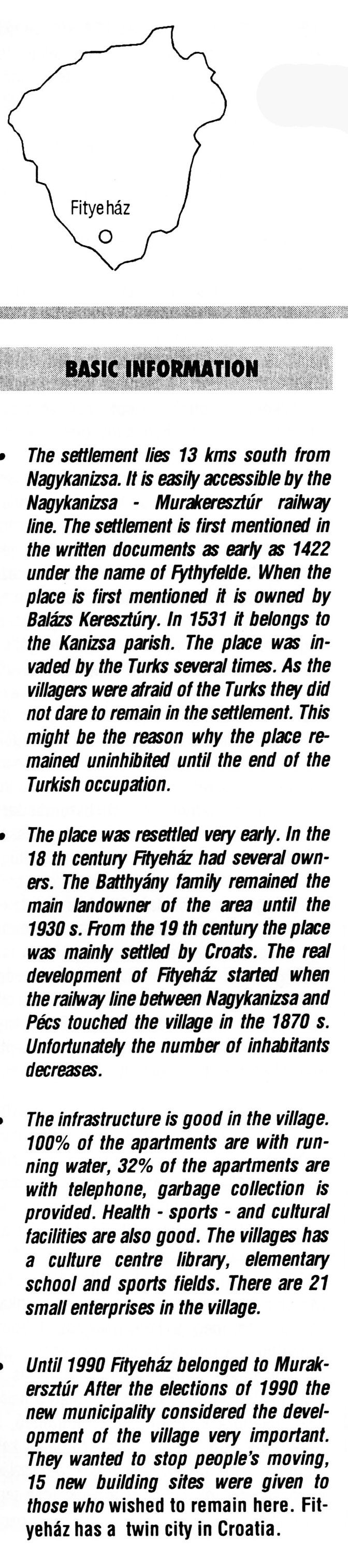 Nyilvános 2215 | 6303 | Fityeház | BASIC INFORMATION The settlement lies 13 kms south from Nagykanizsa. It is easily accessible by the Nagykanizsa - Murakeresztúr railway line. The settlement is first mentioned in the written documents as early as 1422 under the name of Fythyfelde. When the place is first mentioned it is owned by Balázs Keresztúry. In 1531 it belongs to the Kanizsa parish. The place was in¬vaded by the Turks several times. As the villagers were afraid of the Turks they did not dare to remain in the settlement. This might be the reason why the place re¬mained uninhibited until the end of the Turkish occupation. The place was resettled very early. In the 18 th century Fityeház had several own¬ers. The Batthyány family remained the main landowner of the area until the 1930 s. From the 19 th century the place was mainly settled by Croats. The real development of Fityeház started when the railway line between Nagykanizsa and Pécs touched the village in the 1870 s. Unfortunately the number of inhabitants decreases. The infrastructure is good in the village. 100% of the apartments are with run¬ning water, 32% of the apartments are with telephone, garbage collection is provided. Health - sports - and cultural facilities are also good. The villages has a culture centre library, elementary school and sports fields. There are 21 small enterprises in the village. Until 1990 Fityeház belonged to Murakersztúr. After the elections of 1990 the new municipality considered the devel¬opment of the village very important. They wanted to stop people\'s moving, 15 new building sites were given to those who wished to remain here. Fityeház has a twin city in Croatia. This text came from the following book: Title: Handbook of Zala county (Zala megye kézikönyve) Series: County handbooks of Hungary (Magyarország megyei kézikönyvei) Chief editor: Hóbor József Publisher: (Hatvan), CEBA-Hungary Ltd, 1998 ETO: 908.439.121(035) ; 050.8(439.121) ISBN: 963-9089-18-2 Pages: 488-1040 p. Remark: Closed on: 1998. márc. 31. |