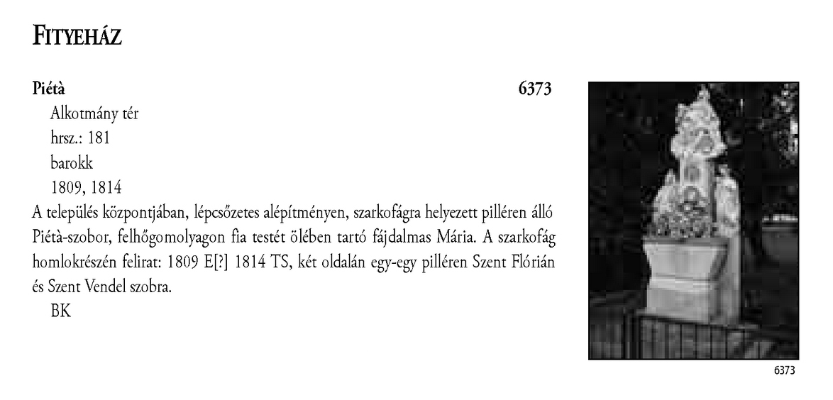 Nyilvános 2185 | 6422 | Fityeház - Magyarország műemlékjegyzéke - Zala megye 2006 027old | A részlet szövege: FITYEHÁZ Piétà 6373 Alkotmány tér hrsz.: 181 barokk 1809, 1814 A település központjában, lépcsőzetes alépítményen, szarkofágra helyezett pilléren álló Piétà-szobor, felhőgomolyagon fia testét ölében tartó fájdalmas Mária. A szarkofág homlokrészén felirat: 1809 E[?] 1814 TS, két oldalán egy-egy pilléren Szent Flórián és Szent Vendel szobra. BK A részlet a következő könyv online változatából származik: Cím: Magyarország műemlékjegyzéke Közreműködő: Haris Andrea. (szerk.) ; Kulturális Örökségvédelmi Hivatal (Budapest) (közread.) ; Somorjay Sélysette. (szerk.) ; Bardoly István (közrem.) Szerz. közl.: [sorozatszerk. Haris Andrea, Somorjay Sélysette] ; [mtárs Bardoly István] ; [közread. a] Kulturális Örökségvédelmi Hivatal. Kiadás: Budapest : KÖH, 2006 Kötetadat: Zala megye ISBN: 963-86510-7-5 ö ISBN: 963 7474 10 2 Nyelv: magyar A jegyzék a Kultúrális Örökségvédelmi Hivatal honlapján, a következő link alatt található: http://www.koh.hu/index.php?_mp=nyitolap&_amp=MUEML A fejléc adatairól 1. Objektum neve – törzsszám A fejléc első sora a műemlék eredeti rendeltetésének megfelelő nevet tartalmazza. Mögötte zárójelben templom esetében annak titulusa, más épületeknél indokolt esetben az eredeti rendeltetéstől eltérő, mai használatra utaló intézmény név (pl. városháza, múzeum, szálloda, oktatási intézmény hivatalos neve, stb.) olvasható. A törzsszám (trsz.) a műemlék egyetlen soha nem változó adata. A gyors azonosítás, illetve a törzsszám szerinti keresés lehetősége végett az objektummal egy sorban, a fejléc jobb szélén kiemelten jelenik meg. Összetartozó műemlék részek vagy történetileg egy együttest alkotó műemlékek sokszor külön törzsszámon lettek műemlékké nyilvánítva. Előfordulhat ezért, hogy egy fejléc alatt a leíró részben több, külön törzsszámmal rendelkező objektum szerepel. A törzsszámot ezekben az esetekben is az objektummal egy sorban tüntetjük fel. 2. Utca, házszám Egy utcán belül, amennyiben a számozás ezt lehetővé teszi, először a templomot adjuk meg, ezt követi a parókia, majd egyéb objektumok, pl. szobrok következnek. Házszám nélkül említünk egyes műemlékfajtákat (elsősorban templomokat), amennyiben a topográfiai azonosítás szempontjából a házszám közömbös vagy éppen zavaró. Előfordul, hogy a műemlék nem köthető nevesített közterülethez. Az ilyeneket a település végéhez soroltuk, és a leírásban kitértünk a településen belül elfoglalt helyükre. 3. Helyrajzi szám Ha egy helyrajzi számon és egy címen (pl. temetőben) több, külön törzsszámmal védett objektum van, akkor az együttesre utaló műemlék megnevezés alatt a közös adatokat egyszer adjuk meg. Ezt követően külön címszavanként következik a műemlékek leírása. Ilyen esetben az emlékeket mutatóztuk. Ezt az eljárást követtük, tekintet nélkül arra, hogy a teljes együttes védett-e vagy sem. (Védett együttes mellett mindig törzsszám szerepel.) Ha több helyrajzi szám is tartozik egy törzsszámhoz, akkor a fejlécben valamennyi számot feltüntettük. Amennyiben ilyen esetben több elemből álló műemlékről van szó, akkor a leíró részben minden külön említett elem után zárójelben megadjuk a vonatkozó helyrajzi számot. 4. Stílus A műemléket jelenleg meghatározó, domináns stílusjegy alapján került meghatározásra. Egyéb, érzékelhető stíluselemekre a leíró részben utalunk. 5. Datálás A műemléket jelenleg leginkább jellemző építési dátum. Korábbi építési periódusokra, illetve későbbi átépítésekre a történeti részben utalunk, fennmaradt részletek esetén lehetőség szerint azokra vonatkoztatva. A leírás A műemlékek leírása tartalmilag öt szakaszból áll, amely folyamatos szövegként jelenik meg. Az objektum topográfiai meghatározása a műemlék településen belüli vagy ahhoz viszonyított helyét adja meg, amennyiben ez az azonosításhoz nélkülözhetetlen, avagy azt segíti. Az emlék jellegének leírása utal a környezettel való kapcsolatra (tájolás, beépítés módja, környező terepviszonyok, amennyiben ezek jellemzőek), alaprajzi elrendezésre, tömegre és a jellegzetes homlokzati elemekre (pl. rizalitok, erkélyek, stb.). Részletes homlokzatleírás nem volt cél. Belső építészeti részletet csak akkor említünk meg, ha ez tartozékként jelentős, esetleg a datálás vagy a stílus meghatározás alapjául szolgált. Ezt követi az épület tartozékainak és berendezésének utalásszerű ismertetése (falfestés, üvegablak, berendezés), az adott elem után zárójelben az ismert mesterek nevével; az orgonát külön említjük, amennyiben hangszerként is műemléki értékkel bír. A mesternevekre, berendezésre történő utalás jelzésszerű, tételes információért a KÖH műemléki nyilvántartásához kell fordulni. A leírást az építéstörténet lényegesnek ítélt momentumainak felsorolása követi, a fejléc tartalmának megismétlése nélkül. Csak olyan adatokat szerepeltetünk, amelyek az építéstörténet szempontjából meghatározóak. A leírásban az építész és az építtető nevére, illetve a kivitelezőre külön utalás történik zárójelben. Az épület egyes részleteire vonatkozó építési dátumokat lehetőség szerint a leíró részben, az egyes épületrészek leírása után közöljük. Zala megye műemlékeinek revíziójára 2002–2003-ban került sor, a kéziratot 2006. augusztus 14-én zártuk le. A műemlékjegy-zék a KÖH hivatalos kiadványa, mely a Műemlékvédelmi Tudományos Intézet gondozásában jelenik meg. RÖVIDÍTÉSEK D – dél É – észak ev. – evangélikus gör. kat. – gör