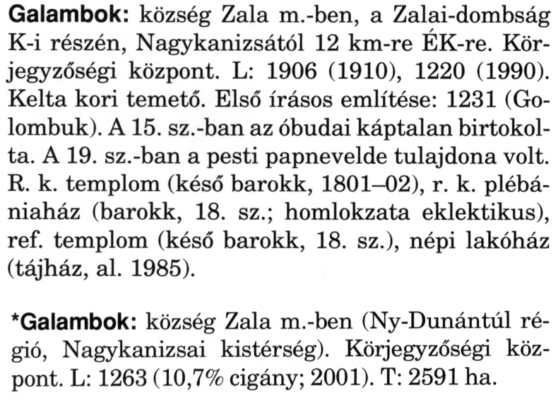 Nyilvános 2561 | 5061 | Rövid leírás | Teljes leírás (2.33 KB) | A szócikkek felismertetett szövege: (A csillag után a kiegészítő kötetből származó szöveg következik) Galambok: község Zala m.-ben, a Zalai-dombság K-i részén, Nagykanizsától 12 km-re ÉK-re. Körjegyzőségi központ. L: 1906 (1910), 1220 (1990). Kelta kori temető. Első írásos említése: 1231 (Go-lombuk). A 15. sz.-ban az óbudai káptalan birtokolta. A 19. sz.-ban a pesti papnevelde tulajdona volt. R. k. templom (késő barokk, 1801-02), r. k. plébániaház (barokk, 18. sz.; homlokzata eklektikus), ref. templom (késő barokk, 18. sz.), népi lakóház (tájház, al. 1985). *Galambok: község Zala m.-ben (Ny-Dunántúl régió, Nagykanizsai kistérség). Körjegyzőségi központ. L: 1263 (10,7% cigány; 2001). T: 2591 ha. A szócikkek a következő lexikonból származnak: Cím: Magyar nagylexikon Közreműködő: Élesztős László (1949) (szerk.) ; Barabás Éva (1943) (szerk.) ; Berényi Gábor (1946) (szerk.) ; Bárány Lászlóné (szerk.) ; Adelmann-né Kertész Judit (1945) (közrem.) ; Froemel Károlyné Jáky Éva (1936) (közrem.) ; Akadémiai Kiadó és Nyomda Vállala Szerz. közl.: [... Élesztős László főszerk.] ; [szerk. Barabás Éva et al.] ; [bibliogr. Adelmanné Kertész Judit] ; [kész. az Akadémiai Kiadó Magyar Nagylexikon Szerkesztőségében] Kiadás: Budapest : Akad. K., 1993- Kötetei: 1. köt., A - Anc 2. köt., And - Bag 3. köt., Bah - Bij 4. köt., Bik - Bz 5. köt., C - Csem 6. köt., Csen - Ec 7. köt., Ed - Fe 8. köt., Ff - Gyep 9. köt., Gyer - Iq 10. köt., Ir - Kip 11. köt., Kir - Lem 12. köt., Len - Mep 13. köt., Mer - Nyk 14. köt., Nyl - Pom 15. köt., Pon - Sek 16. köt., Sel - Szö 17. köt., Szp - Ung 18. köt., Unh - Z 19. köt., Kiegészítő kötet, A - Z ETO jelzet: 030=945.11 Szakjelzet: 030 Cutter: M 14 ISBN: 963-05-6611-7 [!ISBN 963-05-6615-X] Nyelv: magyar Megjegyzés: Az 5. kötettől kiad. a Magyar Nagylexikon Kiadó ; A 6. kötettől főszerk. Berényi Gábor ; A 6. kötettől szakszerk. Bárány Lászlóné et al. ; A 6. kötettől bibliogr. Froemel Károlyné ; Bibliogr. a szócikkek végén |