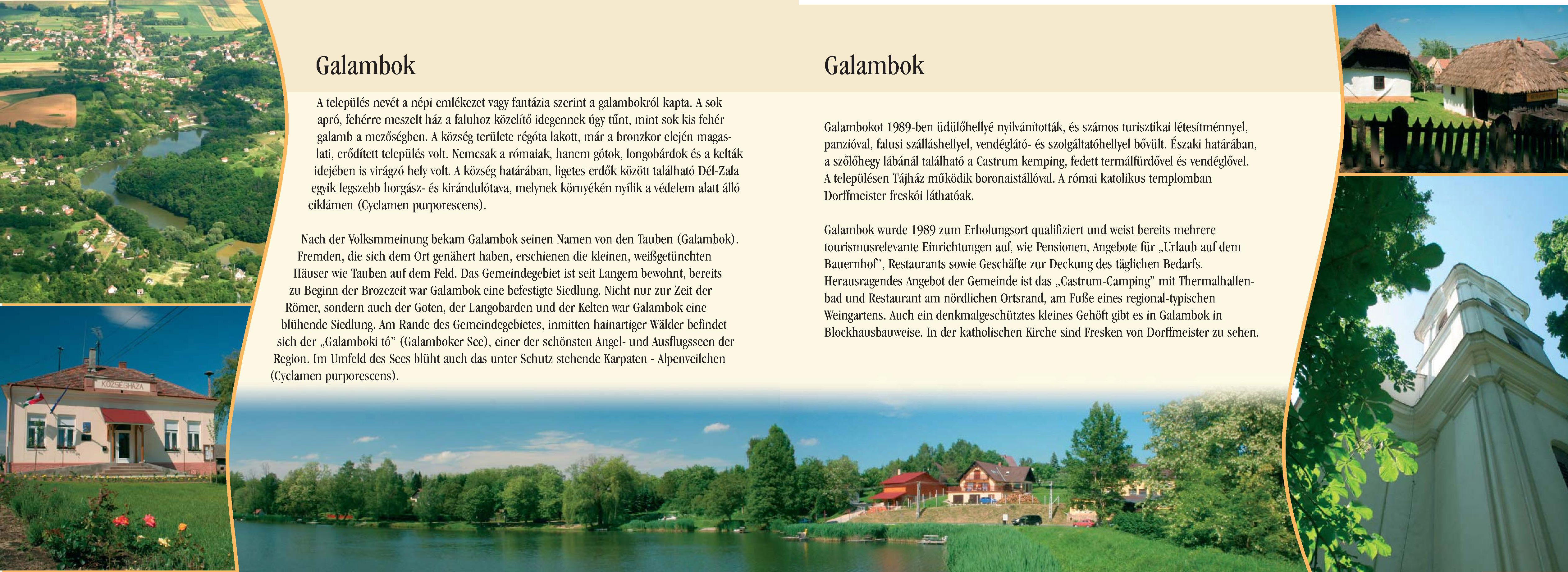 Nyilvános 2429 | 6999 | Galambok | Nach der Volksmmeinung bekam Galambok seinen Namen von den Tauben (Galambok). Fremden, die sich dem Ort genähert haben, erschienen die kleinen, weißgetünchten Häuser wie Tauben auf dem Feld. Das Gemeindegebiet ist seit Langem bewohnt, bereits zu Beginn der Brozezeit war Galambok eine befestigte Siedlung. Nicht nur zur Zeit der Römer, sondern auch der Goten, der Langobarden und der Kelten war Galambok eine blühende Siedlung. Am Rande des Gemeindegebietes, inmitten hainartiger Wälder befindet sich der ,,Galamboki tó" (Galamboker See), einer der schönsten Angel- und Ausflugsseen der Region. Im Umfeld des Sees blüht auch das unter Schutz stehende Karpaten – Alpenveilchen (Cyclamen purporescens). Galambok wurde 1989 zum Erholungsort qualifiziert und weist bereits mehrere tourismusrelevante Einrichtungen auf, wie Pensionen, Angebote für ,,Urlaub auf dem Bauernhof", Restaurants sowie Geschäfte zur Deckung des täglichen Bedarfs. Herausragendes Angebot der Gemeinde ist das ,,Castrum-Camping" mit Thermalhallenbad und Restaurant am nördlichen Ortsrand, am Fuße eines regional-typischen Weingartens. Auch ein denkmalgeschütztes kleines Gehöft gibt es in Galambok in Blockhausbauweise. In der katholischen Kirche sind Fresken von Dorffmeister zu sehen. Dieses Text stammt von: Pannonhát tájpark prospektus 2006. Web: http://www.pannonhat.hu/ (auch in Deutsch) |