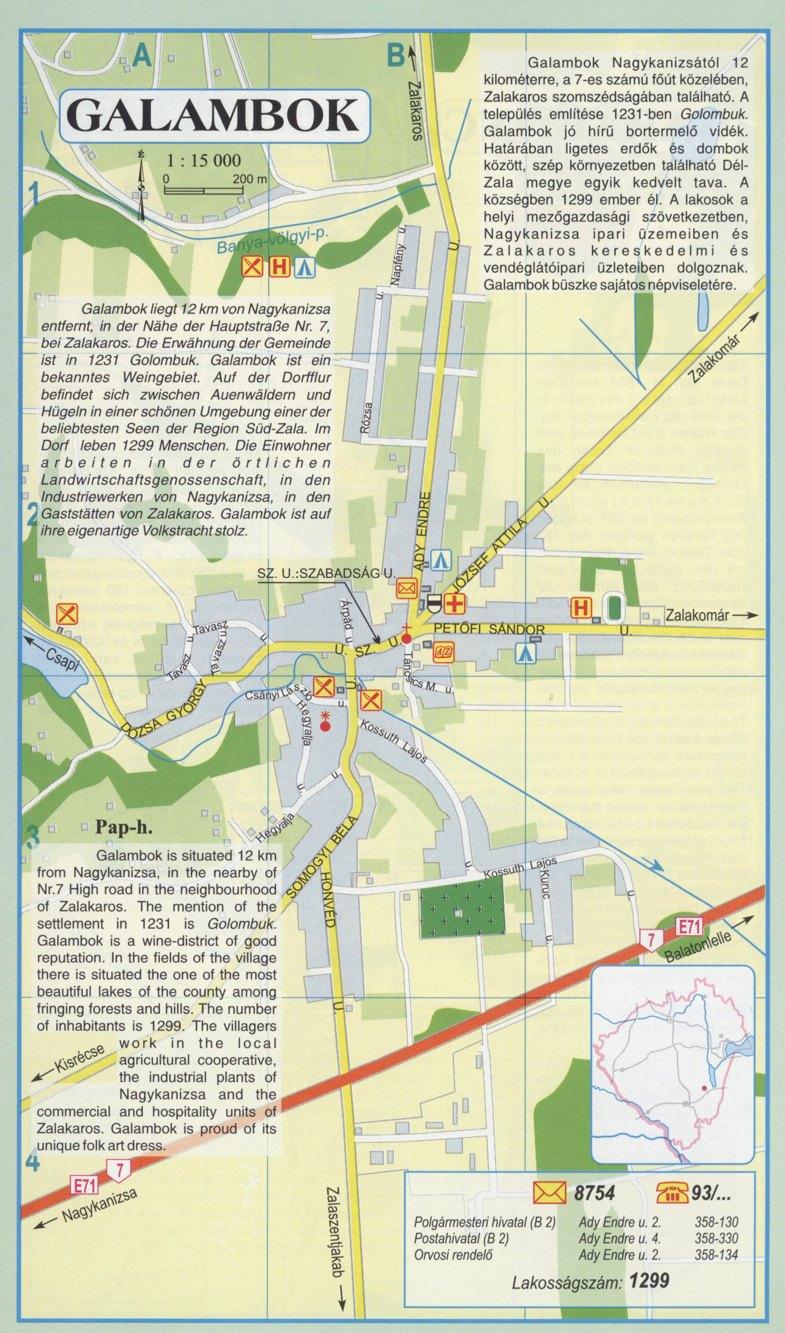 Nyilvános 2394 | 7674 | Galambok | Galambok Nagykanizsától 12 kilométerre, a 7-es számú főút közelében, Zalakaros szomszédságában található. A település említése 1231-ben Golombuk. Galambok jó hírű bortermelő vidék. Határában ligetes erdők és dombok között, szép környezetben található Dél-Zala megye egyik kedvelt tava. A községben 1299 ember él. A lakosok a helyi mezőgazdasági szövetkezetben, Nagykanizsa ipari üzemeiben és Zalakaros kereskedelmi és vendéglátóipari üzleteiben dolgoznak. Galambok büszke sajátos népviseletére. Galambok liegt 12 km von Nagykanizsa entlernt, in der Nähe der Hauptstraße Nr. 7, bei Zalakaros. Die Erwähnung der Gemeinde ist in 1231 Golombuk. Galambok ist ein bekanntes Weingebiet. Auf der Dorfflur befindet sich zwischen Auenwäldern und Hügeln in einer schönen Umgebung einer der beliebtesten Seen der Region Süd-Zala. Im Dorf leben 1299 Menschen. Die Einwohner arbeiten in der örtlichen Landwirtschaftsgenossenschaft, in den Industriewerken von Nagykanizsa, in den Gaststätten von Zalakaros. Galambok ist auf ihre eigenartige Volkstracht stolz. Galambok is situated 12 km from Nagykanizsa, in the nearby of Nr.7 High road in the neighbourhood of Zalakaros. The mention of the settlement in 1231 is Golombuk. Galambok is a wine-district of good reputation. In the fields of the village there is situated the one of the most beautiful lakes of the county among fringing forests and hills. The number of inhabitants is 1299. The villagers work in the local agricultural cooperative, the industrial plants of Nagykanizsa and the commercial and hospitality units of Zalakaros. Galambok is proud of its unique folk art dress. A részlet a következő kiadványból származik/Die Teile stammen vom volgenden Buch/This text came from the following book: Cím/Titel/Title: Zala megye településeinek atlasza - 257 település részletes térképe/Atlas der Komitat Zala - 257 Detailte Siedlungskarten/Zala county\'s Atlas - 257 settlement maps. Közreműködő/contributor: Lackner László (1943) (fotó) Kiadás/Ausgabe/Publisher: Gyula : HISZI-MAP, 1997 Sorozat/Serie/Series: Indulástól - megérkezésig... ETO: 912(439.121-2) ; 908.439.121 Cutter: Z 19 ISBN: 963-610-025-4 Oldalszám/Seiten/Pages: 323, 81 p. Megjegyzés/Note: Lezárva/Abgeschlossen am/Closed am: 1997. máj. 30. |