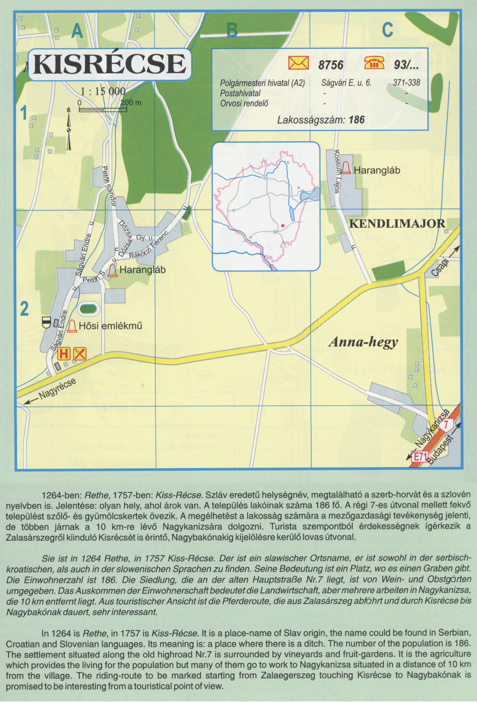 Nyilvános 2391 | 9390 | Rövid leírás | Teljes leírás (2.6 KB) | KISRÉCSE 1264-ben: Rethe, 1757-ben: Kiss-Récse. Szláv eredetű helységnév, megtalálható a szerb-horvát és a szlovén nyelvben is. Jelentése: olyan hely, ahol árok van. A település lakóinak száma 186 fő. A régi 7-es útvonal mellett fekvő települést szőlő- és gyümölcskertek övezik. A megélhetést a lakosság számára a mezőgazdasági tevékenység jelenti, de többen járnak a 10 km-re lévő Nagykanizsára dolgozni. Turista szempontból érdekességnek ígérkezik a Zalasárszegről kiinduló Kisrécsét is érintő, Nagybakónakig kijelölésre kerülő lovas útvonal. Sie ist in 1264 Rethe, in 1757 Kiss-Récse. Der ist ein slawischer Ortsname, er ist sowohl in der serbisch-kroatischen, als auch in der slowenischen Sprachen zu finden. Seine Bedeutung ist ein Platz, wo es einen Graben gibt. Die Einwohnerzahl ist 186. Die Siedlung, die an der alten Hauptstraße Nr.7 liegt, ist von Wein- und Obstgärten umgegeben. Das Auskommen der Einwohnerschaft bedeutet die Landwirtschaft, aber mehrere arbeiten in Nagykanizsa, die 10 km entfernt liegt. Aus touristischer Ansicht ist die Pferderoute, die aus Zalasárszeg abfahrt und durch Kisrécse bis Nagybakónak dauert, sehr interessant. In 1264 is Rethe, in 1757 is Kiss-Récse. It is a place-name of Slav origin, the name could be found in Serbian, Croatian and Slovenian languages. Its meaning is: a place where there is a ditch. The number of the population is 186. The settlement situated along the old highroad Nr.7 is surrounded by vineyards and fruit-gardens. It is the agriculture which provides the living for the population but many of them go to work to Nagykanizsa situated in a distance of 10 km from the village. The riding-route to be marked starting from Zalaegerszeg touching Kisrécse to Nagybakónak is promised to be interesting from a touristical point of view. A részlet a következő kiadványból származik/Die Teile stammen vom volgenden Buch/This text came from the following book: Cím/Titel/Title: Zala megye településeinek atlasza - 257 település részletes térképe/Atlas der Komitat Zala - 257 Detailte Siedlungskarten/Zala county\'s Atlas - 257 settlement maps. Közreműködő/contributor: Lackner László (1943) (fotó) Kiadás/Ausgabe/Publisher: Gyula : HISZI-MAP, 1997 Sorozat/Serie/Series: Indulástól - megérkezésig... ETO: 912(439.121-2) ; 908.439.121 Cutter: Z 19 ISBN: 963-610-025-4 Oldalszám/Seiten/Pages: 323, 81 p. Megjegyzés/Note: Lezárva/Abgeschlossen am/Closed am: 1997. máj. 30. |
