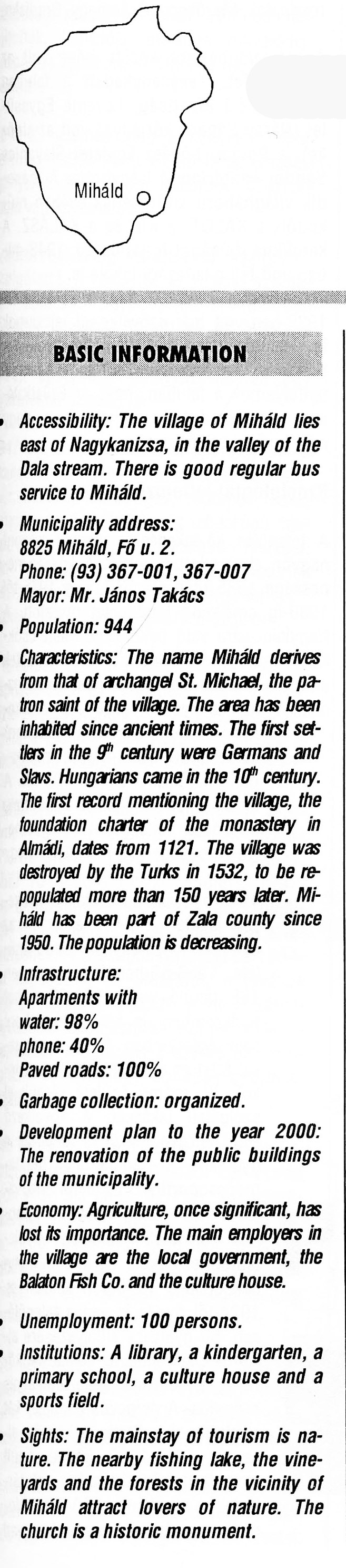 Nyilvános 2294 | 6045 | Rövid leírás | Teljes leírás (2.05 KB) | Miháld BASIC INFORMATION Accessibility: The village of Miháld lies east of Nagykanizsa, in the valley of the Dola stream. There is good regular bus service to Miháld. Municipality address: 8825 Miháld, Fő u. 2. Phone: (93) 367-001, 367-007 Mayor: Mr. János Takács Population: 944 Characteristics: The name Miháld derives from that of archangel St. Michael, the patron saint of the village. The area has been inhabited since ancient times. The first settlers in the 9th century were Germans and Slavs. Hungarians came in the 10th century. The first record mentioning the village, the foundation charter of the monastery in Almádi, dates from 1121. The village was destroyed by the Turks in 1532, to be repopulated more than 150 years later. Miháld has been part of Zala county since 1950. The population is decreasing. Infrastructure: Apartments with water: 98% phone: 40% Paved roads: 100% Garbage collection: organized. Development plan to the year 2000: The renovation of the public buildings of the municipality. Economy: Agriculture, once significant, has lost its importance. The main employers in the village are the local government, the Balaton Fish Co. and the culture house. Unemployment: 100 persons. Institutions: A library, a kindergarten, a primary school, a culture house and a sports field. Sights: The mainstay of tourism is nature. The nearby fishing lake, the vineyards and the forests in the vicinity of Miháld attract lovers of nature. The church is a historic monument. This text came from the following book: Title: Handbook of Zala county (Zala megye kézikönyve) Series: County handbooks of Hungary (Magyarország megyei kézikönyvei) Chief editor: Hóbor József Publisher: (Hatvan), CEBA-Hungary Ltd, 1998 ETO: 908.439.121(035) ; 050.8(439.121) ISBN: 963-9089-18-2 Pages: 488-1040 p. Remark: Closed on: 1998. márc. 31. |