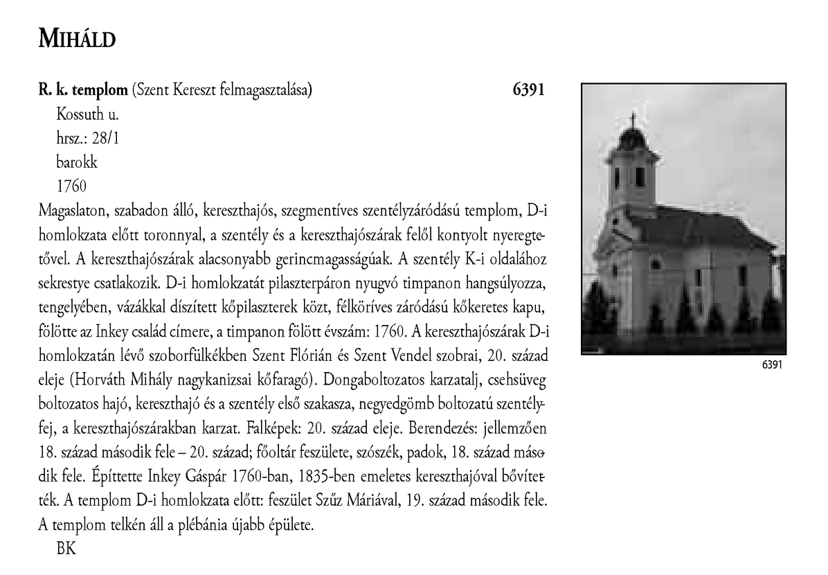 Nyilvános 2333 | 6547 | A részlet szövege: | MIHÁLD R. k. templom (Szent Kereszt felmagasztalása) 6391 Kossuth u. hrsz.: 28/1 barokk 1760 Magaslaton, szabadon álló, kereszthajós, szegmentíves szentélyzáródású templom, D-i homlokzata előtt toronnyal, a szentély és a kereszthajószárak felől kontyolt nyeregtetővel. A kereszthajószárak alacsonyabb gerincmagasságúak. A szentély K-i oldalához sekrestye csatlakozik. D-i homlokzatát pilaszterpáron nyugvó timpanon hangsúlyozza, tengelyében, vázákkal díszített kőpilaszterek közt, félköríves záródású kőkeretes kapu, fölötte az Inkey család címere, a timpanon fölött évszám: 1760. A kereszthajószárak D-i homlokzatán lévő szoborfülkékben Szent Flórián és Szent Vendel szobrai, 20. század eleje (Horváth Mihály nagykanizsai kőfaragó). Dongaboltozatos karzatalj, csehsüveg boltozatos hajó, kereszthajó és a szentély első szakasza, negyedgömb boltozatú szentélyfej, a kereszthajószárakban karzat. Falképek: 20. század eleje. Berendezés: jellemzően 18. század második fele – 20. század; főoltár feszülete, szószék, padok, 18. század második fele. Építtette Inkey Gáspár 1760-ban, 1835-ben emeletes kereszthajóval bővítették. A templom D-i homlokzata előtt: feszület Szűz Máriával, 19. század második fele. A templom telkén áll a plébánia újabb épülete. BK A részlet a következő könyv online változatából származik: Cím: Magyarország műemlékjegyzéke Közreműködő: Haris Andrea. (szerk.) ; Kulturális Örökségvédelmi Hivatal (Budapest) (közread.) ; Somorjay Sélysette. (szerk.) ; Bardoly István (közrem.) Szerz. közl.: [sorozatszerk. Haris Andrea, Somorjay Sélysette] ; [mtárs Bardoly István] ; [közread. a] Kulturális Örökségvédelmi Hivatal. Kiadás: Budapest : KÖH, 2006 Kötetadat: Zala megye ISBN: 963-86510-7-5 ö ISBN: 963 7474 10 2 Nyelv: magyar A jegyzék a Kultúrális Örökségvédelmi Hivatal honlapján, a következő link alatt található: http://www.koh.hu/index.php?_mp=nyitolap&_amp=MUEML A fejléc adatairól 1. Objektum neve – törzsszám A fejléc első sora a műemlék eredeti rendeltetésének megfelelő nevet tartalmazza. Mögötte zárójelben templom esetében annak titulusa, más épületeknél indokolt esetben az eredeti rendeltetéstől eltérő, mai használatra utaló intézmény név (pl. városháza, múzeum, szálloda, oktatási intézmény hivatalos neve, stb.) olvasható. A törzsszám (trsz.) a műemlék egyetlen soha nem változó adata. A gyors azonosítás, illetve a törzsszám szerinti keresés lehetősége végett az objektummal egy sorban, a fejléc jobb szélén kiemelten jelenik meg. Összetartozó műemlék részek vagy történetileg egy együttest alkotó műemlékek sokszor külön törzsszámon lettek műemlékké nyilvánítva. Előfordulhat ezért, hogy egy fejléc alatt a leíró részben több, külön törzsszámmal rendelkező objektum szerepel. A törzsszámot ezekben az esetekben is az objektummal egy sorban tüntetjük fel. 2. Utca, házszám Egy utcán belül, amennyiben a számozás ezt lehetővé teszi, először a templomot adjuk meg, ezt követi a parókia, majd egyéb objektumok, pl. szobrok következnek. Házszám nélkül említünk egyes műemlékfajtákat (elsősorban templomokat), amennyiben a topográfiai azonosítás szempontjából a házszám közömbös vagy éppen zavaró. Előfordul, hogy a műemlék nem köthető nevesített közterülethez. Az ilyeneket a település végéhez soroltuk, és a leírásban kitértünk a településen belül elfoglalt helyükre. 3. Helyrajzi szám Ha egy helyrajzi számon és egy címen (pl. temetőben) több, külön törzsszámmal védett objektum van, akkor az együttesre utaló műemlék megnevezés alatt a közös adatokat egyszer adjuk meg. Ezt követően külön címszavanként következik a műemlékek leírása. Ilyen esetben az emlékeket mutatóztuk. Ezt az eljárást követtük, tekintet nélkül arra, hogy a teljes együttes védett-e vagy sem. (Védett együttes mellett mindig törzsszám szerepel.) Ha több helyrajzi szám is tartozik egy törzsszámhoz, akkor a fejlécben valamennyi számot feltüntettük. Amennyiben ilyen esetben több elemből álló műemlékről van szó, akkor a leíró részben minden külön említett elem után zárójelben megadjuk a vonatkozó helyrajzi számot. 4. Stílus A műemléket jelenleg meghatározó, domináns stílusjegy alapján került meghatározásra. Egyéb, érzékelhető stíluselemekre a leíró részben utalunk. 5. Datálás A műemléket jelenleg leginkább jellemző építési dátum. Korábbi építési periódusokra, illetve későbbi átépítésekre a történeti részben utalunk, fennmaradt részletek esetén lehetőség szerint azokra vonatkoztatva. A leírás A műemlékek leírása tartalmilag öt szakaszból áll, amely folyamatos szövegként jelenik meg. Az objektum topográfiai meghatározása a műemlék településen belüli vagy ahhoz viszonyított helyét adja meg, amennyiben ez az azonosításhoz nélkülözhetetlen, avagy azt segíti. Az emlék jellegének leírása utal a környezettel való kapcsolatra (tájolás, beépítés módja, környező terepviszonyok, amennyiben ezek jellemzőek), alaprajzi elrendezésre, tömegre és a jellegzetes homlokzati elemekre (pl. rizalitok, erkélyek, stb.). Részletes homlokzatleírás nem volt cél. Belső építészeti részletet csak akkor említünk meg, ha ez tartozékként jelentős, esetleg a datálás vagy a stílus meghatározás alapjául szolgált. Ezt követi az épület tartozékainak és berendezésének utalásszerű ismertetése (falfestés, üvegablak, berendezés), az adott elem után zárójelben az ismert mesterek nevével; az orgonát külön említjük, amennyiben hangszerként is műemléki értékkel bír. A mesternevekre, berendezésre történő utalás jelzésszerű, tétele