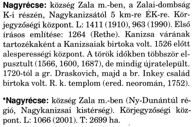 Nyilvános 2377 | 6244 | Rövid leírás | Teljes leírás (2.31 KB) | A szócikkek felismertetett szövege: (A csillag után a kiegészítő kötetből származó szöveg következik) Nagyrécse: község Zala m.-ben, a Zalai-dombság K-i részén, Nagykanizsától 5 km-re ÉK-re. Körjegyzőségi központ. L: 1411 (1910), 963 (1990). Első írásos említése: 1264 (Rethe). Kanizsa várának tartozékaként a Kanizsaiak birtoka volt. 1526 előtt alesperességi központ. A török időkben többször elpusztult (1566, 1600, 1687), de mindig újratelepült. 1720-tól a gr. Draskovich, majd a br. Inkey család birtoka volt. R. k. templom (ered. neoromán, 1752). *Nagyrécse: község Zala m.-ben (Ny-Dunántúl régió, Nagykanizsai kistérség). Körjegyzőségi központ. L: 1066 (2001). T: 2699 ha. A szócikkek a következő lexikonból származnak: Cím: Magyar nagylexikon Közreműködő: Élesztős László (1949) (szerk.) ; Barabás Éva (1943) (szerk.) ; Berényi Gábor (1946) (szerk.) ; Bárány Lászlóné (szerk.) ; Adelmann-né Kertész Judit (1945) (közrem.) ; Froemel Károlyné Jáky Éva (1936) (közrem.) ; Akadémiai Kiadó és Nyomda Vállala Szerz. közl.: [... Élesztős László főszerk.] ; [szerk. Barabás Éva et al.] ; [bibliogr. Adelmanné Kertész Judit] ; [kész. az Akadémiai Kiadó Magyar Nagylexikon Szerkesztőségében] Kiadás: Budapest : Akad. K., 1993- Kötetei: 1. köt., A - Anc 2. köt., And - Bag 3. köt., Bah - Bij 4. köt., Bik - Bz 5. köt., C - Csem 6. köt., Csen - Ec 7. köt., Ed - Fe 8. köt., Ff - Gyep 9. köt., Gyer - Iq 10. köt., Ir - Kip 11. köt., Kir - Lem 12. köt., Len - Mep 13. köt., Mer - Nyk 14. köt., Nyl - Pom 15. köt., Pon - Sek 16. köt., Sel - Szö 17. köt., Szp - Ung 18. köt., Unh - Z 19. köt., Kiegészítő kötet, A - Z ETO jelzet: 030=945.11 Szakjelzet: 030 Cutter: M 14 ISBN: 963-05-6611-7 [!ISBN 963-05-6615-X] Nyelv: magyar Megjegyzés: Az 5. kötettől kiad. a Magyar Nagylexikon Kiadó ; A 6. kötettől főszerk. Berényi Gábor ; A 6. kötettől szakszerk. Bárány Lászlóné et al. ; A 6. kötettől bibliogr. Froemel Károlyné ; Bibliogr. a szócikkek végén |
