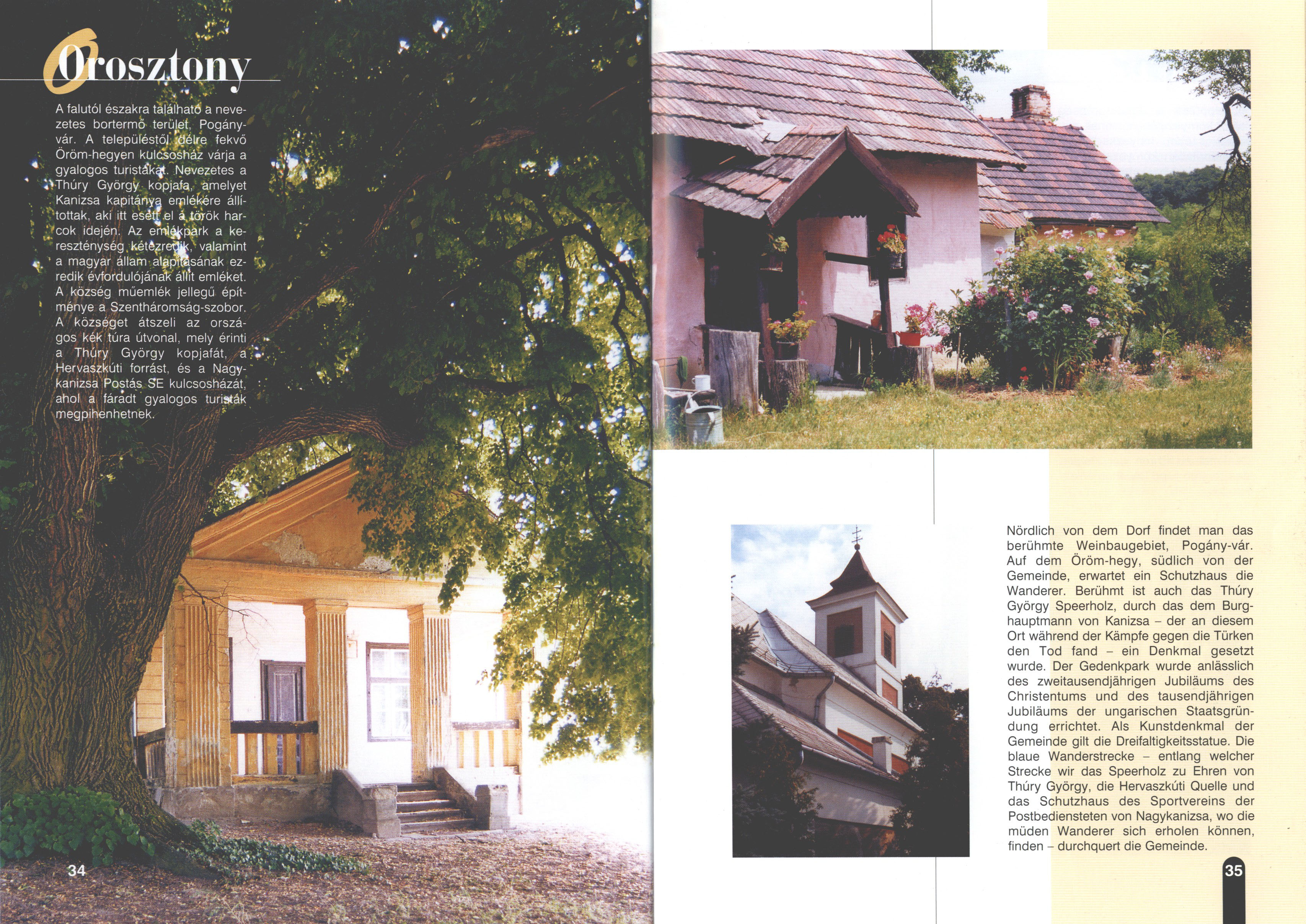 Nyilvános 2508 | 8196 | Rövid leírás | Teljes leírás (1.49 KB) | Orosztony Nördlich von dem Dorf findet man das berühmte Weinbaugebiet, Pogány-vár. Auf dem Öröm-hegy, südlich von der Gemeinde, erwartet ein Schutzhaus die Wanderer. Berühmt ist auch das Thúry György Speerholz, durch das dem Burghauptmann von Kanizsa - der an diesem Ort während der Kämpfe gegen die Türken den Tod fand - ein Denkmal gesetzt wurde. Der Gedenkpark wurde anlässlich des zweitausendjährigen Jubiläums des Christentums und des tausendjährigen Jubiläums der ungarischen Staatsgründung errichtet. Als Kunstdenkmal der Gemeinde gilt die Dreifaltigkeitsstatue. Die blaue Wanderstrecke - entlang welcher Strecke wir das Speerholz zu Ehren von Thúry György, die Hervaszkúti Quelle und das Schutzhaus des Sportvereins der Postbediensteten von Nagykanizsa, wo die müden Wanderer sich erholen können, finden - durchquert die Gemeinde. Dieses Text stammt von: Titel: Hívogató a Régiók Kapujában - Útikönyv Látnivalók Nagykanizsán és Térségében (Einladend in dem Tor des Gebiets - Reisebuch - Sehenswürdigkeiten in Nagykanizsa und Umgebung) Herausgegeben von: Nagykanizsa és a Környező Települések Területfejlesztési Társulása (Verein für Gebietsentwicklung in Nagykanizsa und in ihrer Umgebung) 8800 Nagykanizsa, Petőfi Sándor út 5. Tel.: 06 93/536-453 • 06 93/536-454 Tel ./Fax: 06 93/326-323 E-mail: terstars@axelero.hu www.kanizsaterseg.celodin.hu |