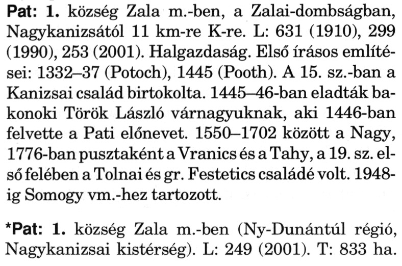 Nyilvános 2299 | 5625 | A szócikkek felismertetett szövege: | (A csillag után a kiegészítő kötetből származó szöveg következik) Pat: 1. község Zala m.-ben, a Zalai-dombságban, Nagykanizsától 11 km-re K-re. L: 631 (1910), 299 (1990), 253 (2001). Halgazdaság. Első írásos említései: 1332-37 (Potoch), 1445 (Pooth). A 15. sz.-ban a Kanizsai család birtokolta. 1445-46-ban eladták bakonoki Török László várnagyuknak, aki 1446-ban felvette a Pati előnevet. 1550-1702 között a Nagy, 1776-ban pusztaként a Vranics és a Tahy, a 19. sz. első felében a Tolnai és gr. Festetics családé volt. 1948-ig Somogy vm.-hez tartozott. *Pat: 1. község Zala m.-ben (Ny-Dunántúl régió, Nagykanizsai kistérség). L: 249 (2001). T: 833 ha. A szócikkek a következő lexikonból származnak: Cím: Magyar nagylexikon Közreműködő: Élesztős László (1949) (szerk.) ; Barabás Éva (1943) (szerk.) ; Berényi Gábor (1946) (szerk.) ; Bárány Lászlóné (szerk.) ; Adelmann-né Kertész Judit (1945) (közrem.) ; Froemel Károlyné Jáky Éva (1936) (közrem.) ; Akadémiai Kiadó és Nyomda Vállala Szerz. közl.: [... Élesztős László főszerk.] ; [szerk. Barabás Éva et al.] ; [bibliogr. Adelmanné Kertész Judit] ; [kész. az Akadémiai Kiadó Magyar Nagylexikon Szerkesztőségében] Kiadás: Budapest : Akad. K., 1993- Kötetei: 1. köt., A - Anc 2. köt., And - Bag 3. köt., Bah - Bij 4. köt., Bik - Bz 5. köt., C - Csem 6. köt., Csen - Ec 7. köt., Ed - Fe 8. köt., Ff - Gyep 9. köt., Gyer - Iq 10. köt., Ir - Kip 11. köt., Kir - Lem 12. köt., Len - Mep 13. köt., Mer - Nyk 14. köt., Nyl - Pom 15. köt., Pon - Sek 16. köt., Sel - Szö 17. köt., Szp - Ung 18. köt., Unh - Z 19. köt., Kiegészítő kötet, A - Z ETO jelzet: 030=945.11 Szakjelzet: 030 Cutter: M 14 ISBN: 963-05-6611-7 [!ISBN 963-05-6615-X] Nyelv: magyar Megjegyzés: Az 5. kötettől kiad. a Magyar Nagylexikon Kiadó ; A 6. kötettől főszerk. Berényi Gábor ; A 6. kötettől szakszerk. Bárány Lászlóné et al. ; A 6. kötettől bibliogr. Froemel Károlyné ; Bibliogr. a szócikkek végén |