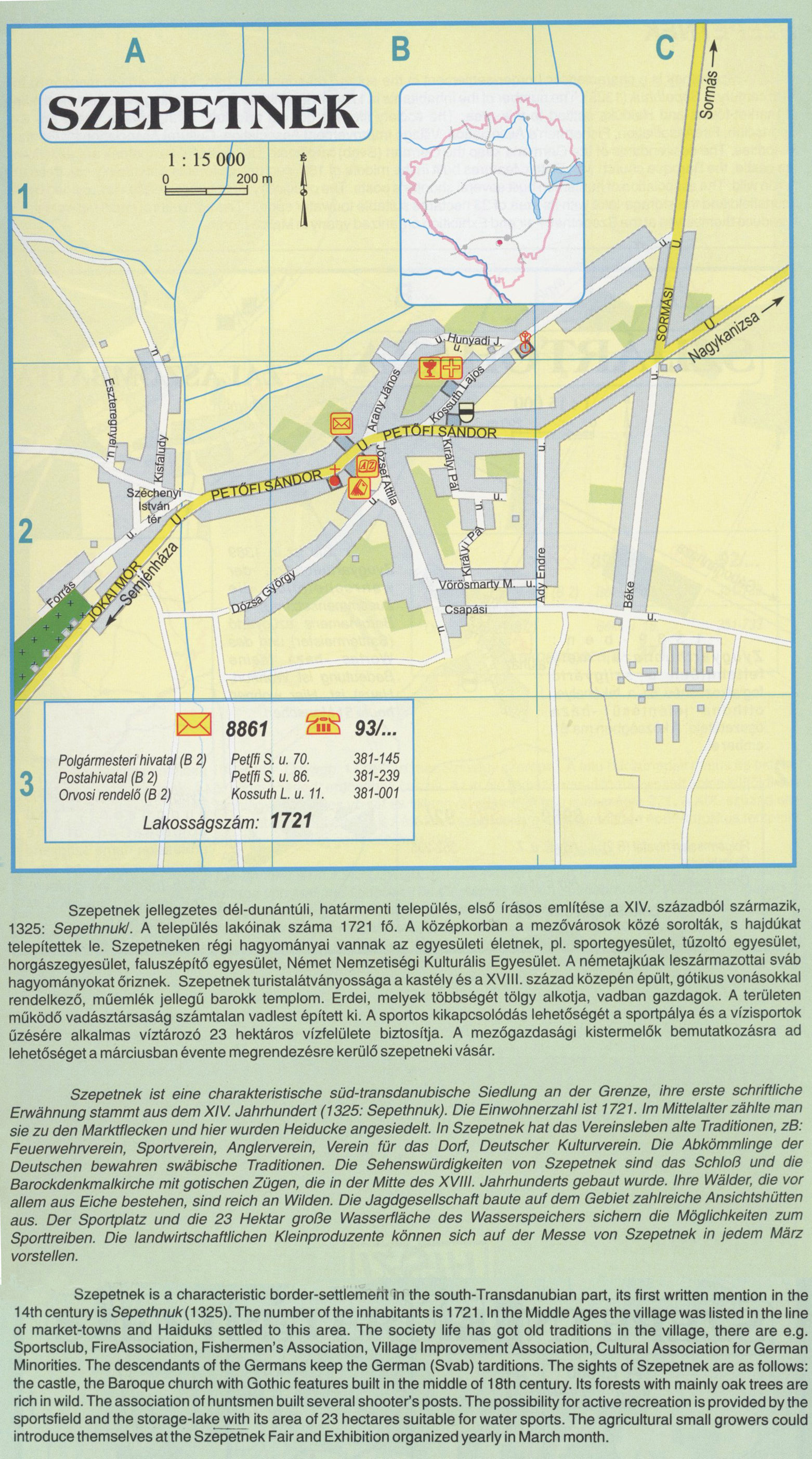 Nyilvános 2135 | 14772 | Szepetnek | Szepetnek jellegzetes dél-dunántúli, határmenti település, első írásos említése a XIV. századból származik, 1325: Sepethnukl. A település lakóinak száma 1721 fő. A középkorban a mezővárosok közé sorolták, s hajdúkat telepítettek le. Szepetneken régi hagyományai vannak az egyesületi életnek, pl. sportegyesület, tűzoltó egyesület, horgászegyesület, faluszépítő egyesület, Német Nemzetiségi Kulturális Egyesület. A németajkúak leszármazottai sváb hagyományokat őriznek. Szepetnek turistalátványossága a kastély és a XVIII. század közepén épült, gótikus vonásokkal rendelkező, műemlék jellegű barokk templom. Erdei, melyek többségét tölgy alkotja, vadban gazdagok. A területen működő vadásztársaság számtalan vadlest épített ki. A sportos kikapcsolódás lehetőségét a sportpálya és a vízisportok űzésére alkalmas víztározó 23 hektáros vízfelülete biztosítja. A mezőgazdasági kistermelők bemutatkozására ad lehetőséget a márciusban évente megrendezésre kerülő szepetneki vásár. Szepetnek ist eine charakteristische süd-transdanubische Siedlung an der Grenze, ihre erste schriftliche Erwähnung stammt aus dem XIV. Jahrhundert (1325: Sepethnuk), Die Einwohnerzahl ist 1721. Im Mittelalter zählte man sie zu den Marktflecken und hier wurden Heiducke angesiedelt. In Szepetnek hat das Vereinsleben alte Traditionen, zB: Feuerwehrverein, Sportverein, Anglerverein, Verein für das Dorf, Deutscher Kulturverein. Die Abkömmlinge der Deutschen bewahren swäbische Traditionen. Die Sehenswürdigkeiten von Szepetnek sind das Schloß und die Barockdenkmalkirche mit gotischen Zügen, die in der Mitte des XVIII. Jahrhunderts gebaut wurde. Ihre Wälder, die vor allem aus Eiche bestehen, sind reich an Wilden. Die Jagdgesellschaft baute auf dem Gebiet zahlreiche Ansichtshütten aus. Der Sportplatz und die 23 Hektar große Wasserfläche des Wasserspeichers sichern die Möglichkeiten zum Sporttreiben. Die landwirtschaftlichen Kleinproduzente können sich auf der Messe von Szepetnek in jedem März vorstellen. Szepetnek is a characteristic border-settlement in the south-Transdanubian part, its first written mention in the 14th century is Sepethnuk(1325). The number of the inhabitants is 1721. In the Middle Ages the village was listed in the line of market-towns and Haiduks settled to this area. The society life has got old traditions in the village, there are e.g. Sportsclub, FireAssociation, Fishermen\'s Association, Village Improvement Association, Cultural Association for German Minorities. The descendants of the Germans keep the German (Svab) tarditions. The sights of Szepetnek are as follows: the castle, the Baroque church with Gothic features built in the middle of 18th century. Its forests with mainly oak trees are rich in wild. The association of huntsmen built several shooter\'s posts. The possibility for active recreation is provided by the sportsfield and the storage-lake with its area of 23 hectares suitable for water sports. The agricultural small growers could introduce themselves at the Szepetnek Fair and Exhibition organized yearly in March month. A részlet a következő kiadványból származik/Die Teile stammen vom volgenden Buch/This text came from the following book: Cím/Titel/Title: Zala megye településeinek atlasza - 257 település részletes térképe/Atlas der Komitat Zala - 257 Detailte Siedlungskarten/Zala county\'s Atlas - 257 settlement maps. Közreműködő/contributor: Lackner László (1943) (fotó) Kiadás/Ausgabe/Publisher: Gyula : HISZI-MAP, 1997 Sorozat/Serie/Series: Indulástól - megérkezésig... ETO: 912(439.121-2) ; 908.439.121 Cutter: Z 19 ISBN: 963-610-025-4 Oldalszám/Seiten/Pages: 323, 81 p. Megjegyzés/Note: Lezárva/Abgeschlossen am/Closed am: 1997. máj. 30. |