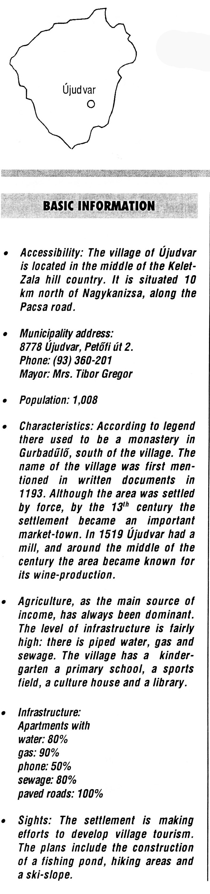 Nyilvános 2231 | 6229 | Újudvar | BASIC INFORMATION Accessibility: The village of Újudvar is located in the middle of the Kelet-Zala hill country. It is situated 10 km north of Nagykanizsa, along the Pacsa road. Municipality address: 8778 Újudvar, Petőfi út 2. Phone: (93) 360-201 Mayor: Mrs. Tibor Gregor Population: 1,008 Characteristics: According to legend there used to be a monastery in Gurbadűlő, south of the village. The name of the village was first mentioned in written documents in 1193. Although the area was settled by force, by the 13th century the settlement became an important market-town. In 1519 Újudvar had a mill, and around the middle of the century the area became known for its wine-production. Agriculture, as the main source of income, has always been dominant. The level of infrastructure is fairly high: there is piped water, gas and sewage. The village has a kindergarten a primary school, a sports field, a culture house and a library. Infrastructure: Apartments with water: 80% gas: 90% phone: 50% sewage: 80% paved roads: 100% Sights: The settlement is making efforts to develop village tourism. The plans include the construction of a fishing pond, hiking areas and a ski-slope. This text came from the following book: Title: Handbook of Zala county (Zala megye kézikönyve) Series: County handbooks of Hungary (Magyarország megyei kézikönyvei) Chief editor: Hóbor József Publisher: (Hatvan), CEBA-Hungary Ltd, 1998 ETO: 908.439.121(035) ; 050.8(439.121) ISBN: 963-9089-18-2 Pages: 488-1040 p. Remark: Closed on: 1998. márc. 31. |