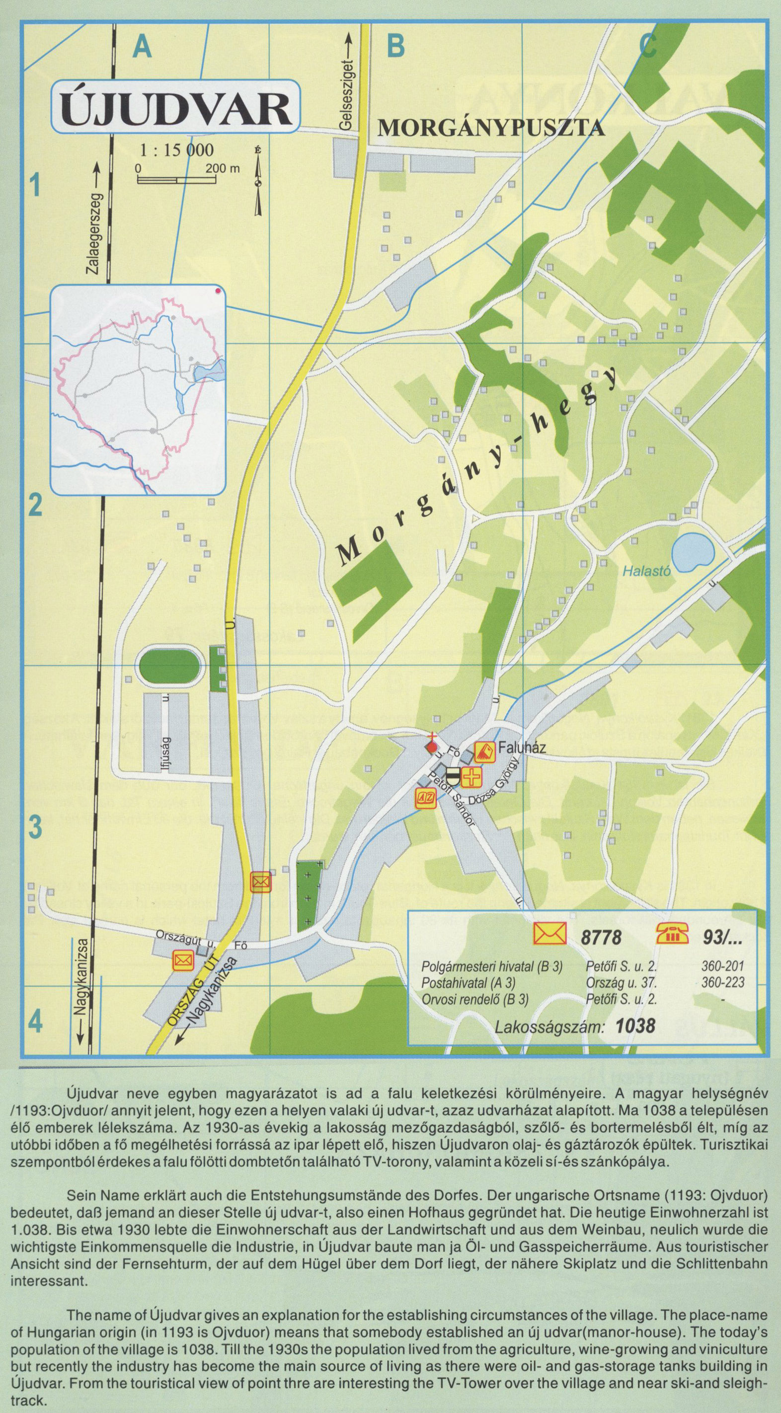 Nyilvános 2185 | 5760 | ÚJUDVAR | Újudvar neve egyben magyarázatot is ad a falu keletkezési körülményeire. A magyar helységnév /1193:Ojvduor/ annyit jelent, hogy ezen a helyen valaki új udvar-t, azaz udvarházat alapított. Ma 1038 a településen élő emberek lélekszáma. Az 1930-as évekig a lakosság mezőgazdaságból, szőlő- és bortermelésből élt, míg az utóbbi időben a fő megélhetési forrássá az ipar lépett elő, hiszen Újudvaron olaj- és gáztározók épültek. Turisztikai szempontból érdekes a falu fölötti dombtetőn található TV-torony, valamint a közeli sí-és szánkópálya. Sein Name erklärt auch die Entstehungsumstände des Dorfes. Der ungarische Ortsname (1193: Ojvduor) bedeutet, daß jemand an dieser Stelle új udvar-t, also einen Hofhaus gegründet hat. Die heutige Einwohnerzahl ist 1.038. Bis etwa 1930 lebte die Einwohnerschaft aus der Landwirtschaft und aus dem Weinbau, neulich wurde die wichtigste Einkommensquelle die Industrie, in Újudvar baute man ja Öl- und Gasspeicherräume. Aus touristischer Ansicht sind der Fernsehturm, der auf dem Hügel über dem Dorf liegt, der nähere Skiplatz und die Schlittenbahn interessant. The name of Újudvar gives an explanation for the establishing circumstances of the village. The place-name of Hungarian origin (in 1193 is Ojvduor) means that somebody established an új udvar(manor-house). The today\'s population of the village is 1038. Till the 1930s the population lived from the agriculture, wine-growing and viniculture but recently the industry has become the main source of living as there were oil- and gas-storage tanks building in Újudvar. From the touristical view of point thre are interesting the TV-Tower over the village and near ski-and sleigh-track. A részlet a következő kiadványból származik/Die Teile stammen vom volgenden Buch/This text came from the following book: Cím/Titel/Title: Zala megye településeinek atlasza - 257 település részletes térképe/Atlas der Komitat Zala - 257 Detailte Siedlungskarten/Zala county\'s Atlas - 257 settlement maps. Közreműködő/contributor: Lackner László (1943) (fotó) Kiadás/Ausgabe/Publisher: Gyula : HISZI-MAP, 1997 Sorozat/Serie/Series: Indulástól - megérkezésig... ETO: 912(439.121-2) ; 908.439.121 Cutter: Z 19 ISBN: 963-610-025-4 Oldalszám/Seiten/Pages: 323, 81 p. Megjegyzés/Note: Lezárva/Abgeschlossen am/Closed am: 1997. máj. 30. |