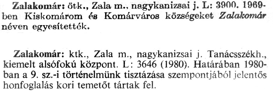 Nyilvános 1900 | 5325 | Rövid leírás | Teljes leírás (1.18 KB) | A szócikkek felismertetett szövege: (A második szócikk az 1981-es kiadású kiegészítő kötetből származik) Zalakomár: ötk., Zala m., nagykanizsai j. L: 3900. 1969-ben Kiskomárom és Komárváros községeket Zalakomár néven egyesítették. Zalakomár: ktk., Zala m., nagykanizsai j. Tanácsszékh., kiemelt alsófokú központ. L: 3646 (1980). Határában 1980-ban a 9. sz.-i történelmünk tisztázása szempontjából jelentős honfoglalás kori temetőt tártak fel. A szócikkek a következő lexikonból származnak: Cím: Új magyar lexikon Közreműködő: Berei Andor (1900-1979) (szerk.) Szerz. közl.: [szerk. Berei Andor et al.] Kiadás jelzés: 2. lny. Kiadás: Budapest : Akad. K., 1961-1962 Kötetei: 1., A - C 2., D - F 3., G - J 4., K - Me 5., Mf - R 6., S - Z 7. köt., A-Z Kiegészítő kötet (1972) Kiegészítő kötet, 1962÷1980 (1981) ETO jelzet: 03=945.11 Szakjelzet: 030 Cutter: U 28 Nyelv: magyar Megjegyzés: Bibliogr. a címszavak egy részének végén |