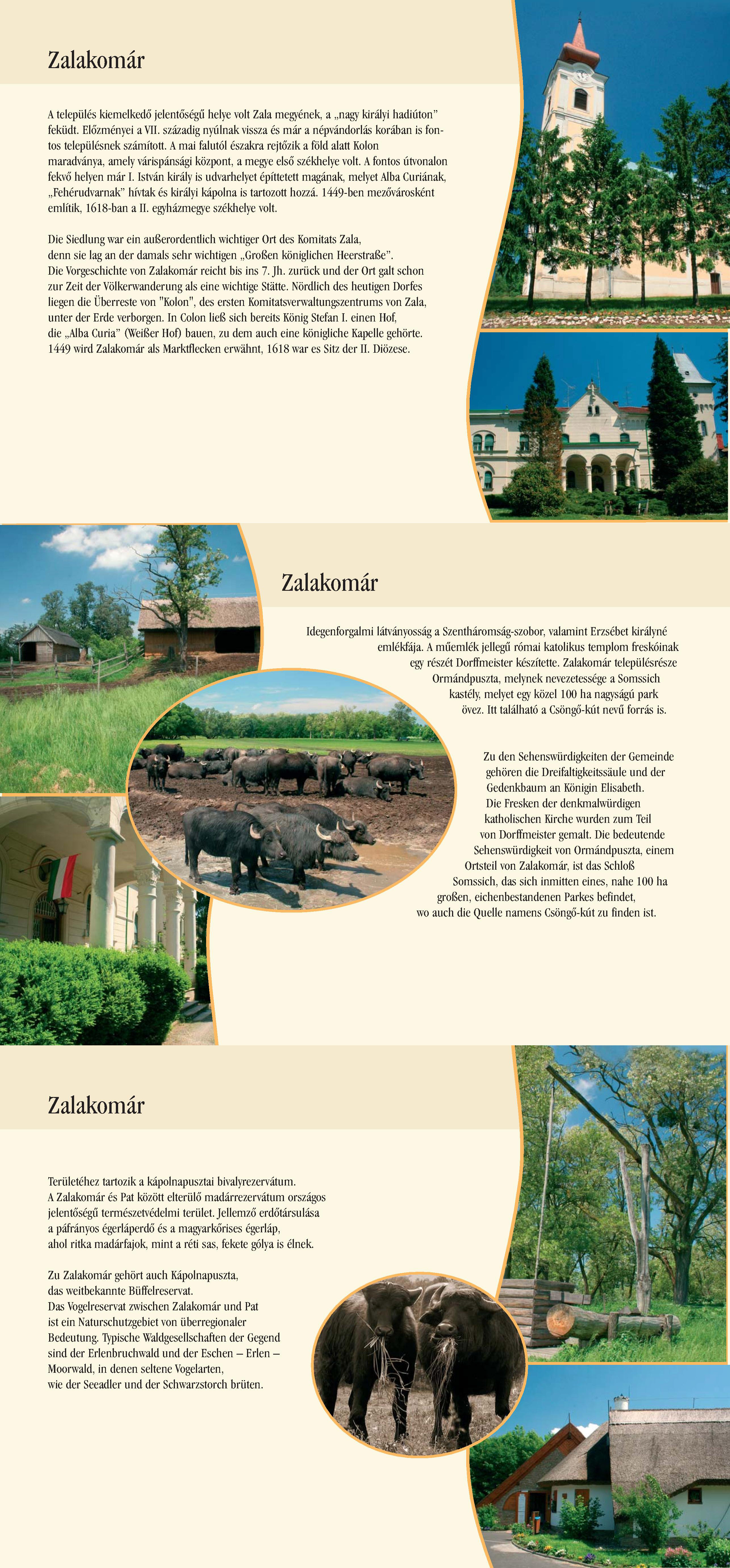 Nyilvános 2330 | 6321 | Zalakomár | Die Siedlung war ein außerordentlich wichtiger Ort des Komitats Zala, denn sie lag an der damals sehr wichtigen ,,Großen königlichen Heerstraße". Die Vorgeschichte von Zalakomár reicht bis ins 7. Jh. zurück und der Ort galt schon zur Zeit der Völkerwanderung als eine wichtige Stätte. Nördlich des heutigen Dorfes liegen die Überreste von "Kolon", des ersten Komitatsverwaltungszentrums von Zala, unter der Erde verborgen. In Colon ließ sich bereits König Stefan I. einen Hof, die ,,Alba Curia" (Weißer Hof) bauen, zu dem auch eine königliche Kapelle gehörte. 1449 wird Zalakomár als Marktflecken erwähnt, 1618 war es Sitz der II. Diözese. Zu den Sehenswürdigkeiten der Gemeinde gehören die Dreifaltigkeitssäule und der Gedenkbaum an Königin Elisabeth. Die Fresken der denkmalwürdigen katholischen Kirche wurden zum Teil von Dorffmeister gemalt. Die bedeutende Sehenswürdigkeit von Ormándpuszta, einem Ortsteil von Zalakomár, ist das Schloß Somssich, das sich inmitten eines, nahe 100 ha großen, eichenbestandenen Parkes befindet, wo auch die Quelle namens Csöngő-kút zu finden ist. Zu Zalakomár gehört auch Kápolnapuszta, das weitbekannte Büffelreservat. Das Vogelreservat zwischen Zalakomár und Pat ist ein Naturschutzgebiet von überregionaler Bedeutung. Typische Waldgesellschaften der Gegend sind der Erlenbruchwald und der Eschen - Erlen - Moorwald, in denen seltene Vogelarten, wie der Seeadler und der Schwarzstorch brüten. Dieses Text stammt von: Pannonhát tájpark prospektus 2006. Web: http://www.pannonhat.hu/ (auch in Deutsch) |