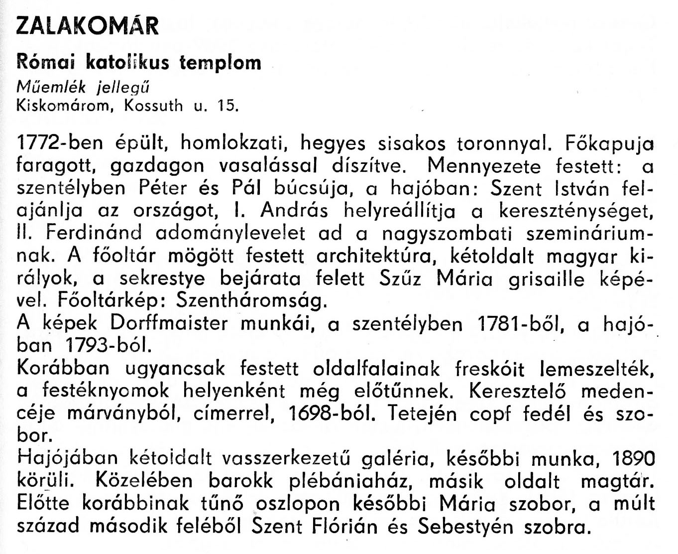 Nyilvános 1872 | 4979 | Zalakomár - Zala megye műemlékei 1977 097old | A részlet szövege: ZALAKOMÁR Római katolikus templom Műemlék jellegű Kiskomárom, Kossuth u. 15. 1772-ben épült, homlokzati, hegyes sisakos toronnyal. Főkapuja faragott, gazdagon vasalással díszítve. Mennyezete festett: a szentélyben Péter és Pál búcsúja, a hajóban: Szent István felajánlja az országot, I. András helyreállítja a kereszténységet, II. Ferdinánd adománylevelet ad a nagyszombati szemináriumnak. A főoltár mögött festett architektúra, kétoldalt magyar királyok, a sekrestye bejárata felett Szűz Mária grisaille képével. Főoltárkép: Szentháromság. A képek Dorffmaister munkái, a szentélyben 1781-ből, a hajóban 1793-ból. Korábban ugyancsak festett oldalfalainak freskóit lemeszelték, a festéknyomok helyenként még előtűnnek. Keresztelő medencéje márványból, címerrel, 1698-ból. Tetején copf fedél és szobor. Hajójában kétoldalt vasszerkezetű galéria, későbbi munka, 1890 körüli. Közelében barokk plébániaház, másik oldalt magtár. Előtte korábbinak tűnő oszlopon későbbi Mária szobor, a múlt század második feléből Szent Flórián és Sebestyén szobra. A részlet a következő könyvből származik: Cím: Zala megye műemlékei Szerző: Németh József (1928) Közreműködő: Lantos Miklós (fotó) Szerz. közl.: Németh József ; [fotók... Lantos Miklós] Kiadás: Zalaegerszeg : Zalai Ny., 1977 ETO jelzet: 72(439.121) ; 7.025.3/.4 ; 908.439.121 Tárgyszó: Zala megye Szakjelzet: 908 Cutter: N 53 Nyelv: magyar Oldalszám: 109 p. |