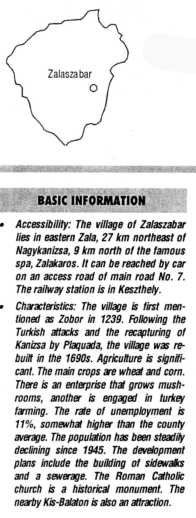 Nyilvános 2356 | 7936 | Rövid leírás | Teljes leírás (1.33 KB) | Zalaszabar BASIC INFORMATION Accessibility: The village of Zalaszabar lies in eastern Zala, 27 km northeast of Nagykanizsa, 9 km north of the famous spa, Zalakaros. It can be reached by car on an access road of main road No. 7. The railway station is in Keszthely. Characteristics: The village is first mentioned as Zobor in 1239. Following the Turkish attacks and the recapturing of Kanizsa by Plaquada, the village was rebuilt in the 1690s. Agriculture is significant. The main crops are wheat and corn. There is an enterprise that grows mushrooms, another is engaged in turkey farming. The rate of unemployment is 11%, somewhat higher than the county average. The population has been steadily declining since 1945. The development plans include the building of sidewalks and a sewerage. The Roman Catholic church is a historical monument. The nearby Kis-Balaton is also an attraction. This text came from the following book: Title: Handbook of Zala county (Zala megye kézikönyve) Series: County handbooks of Hungary (Magyarország megyei kézikönyvei) Chief editor: Hóbor József Publisher: (Hatvan), CEBA-Hungary Ltd, 1998 ETO: 908.439.121(035) ; 050.8(439.121) ISBN: 963-9089-18-2 Pages: 488-1040 p. Remark: Closed on: 1998. márc. 31. |