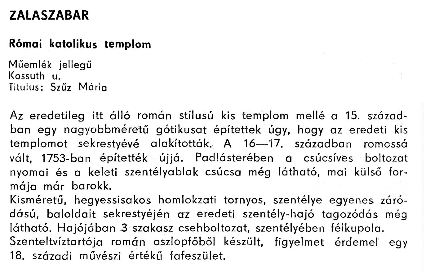 Nyilvános 2119 | 5597 | Rövid leírás | Teljes leírás (1.53 KB) | Zalaszabar - Zala megye műemlékei 1979 119-120old A részlet szövege: ZALASZABAR Római katolikus templom Műemlék jellegű Kossuth u. Titulus: Szűz Mária Az eredetileg itt álló román stílusú kis templom mellé a 15. században egy nagyobbméretű gótikusat építettek úgy, hogy az eredeti kis templomot sekrestyévé alakították. A 16–17. században romossá vált, 1753-ban építették újjá. Padlásterében a csúcsíves boltozat nyomai és a keleti szentélyablak csúcsa még látható, mai külső formája már barokk. Kisméretű, hegyessisakos homlokzati tornyos, szentélye egyenes záródású, baloldalt sekrestyéjén az eredeti szentély-hajó tagozódás még látható. Hajójában 3 szakasz csehboltozat, szentélyében félkupola. Szenteltvíztartója román oszlopfőből készült, figyelmet érdemel egy 18. századi művészi értékű fafeszület. A részlet a következő könyvből származik: Cím: Zala megye műemlékei Szerző: Németh József (1928) Közreműködő: Vándor László (szerk.) ; Szabóky Zsolt (1941) (fotó) Szerz. közl.: Németh József ; [szerk. Vándor László] ; [fotók... Szabóky Zsolt] Kiadás jelzés: 2. bőv. kiad. Kiadás: Zalaegerszeg : Zalai Ny., 1979 ETO jelzet: 72(439.121) ; 7.025.3/.4(439.121) ; 908.439.121 Tárgyszó: Zala Szakjelzet: 908 Cutter: N 53 Nyelv: magyar Oldalszám: 134 p. |