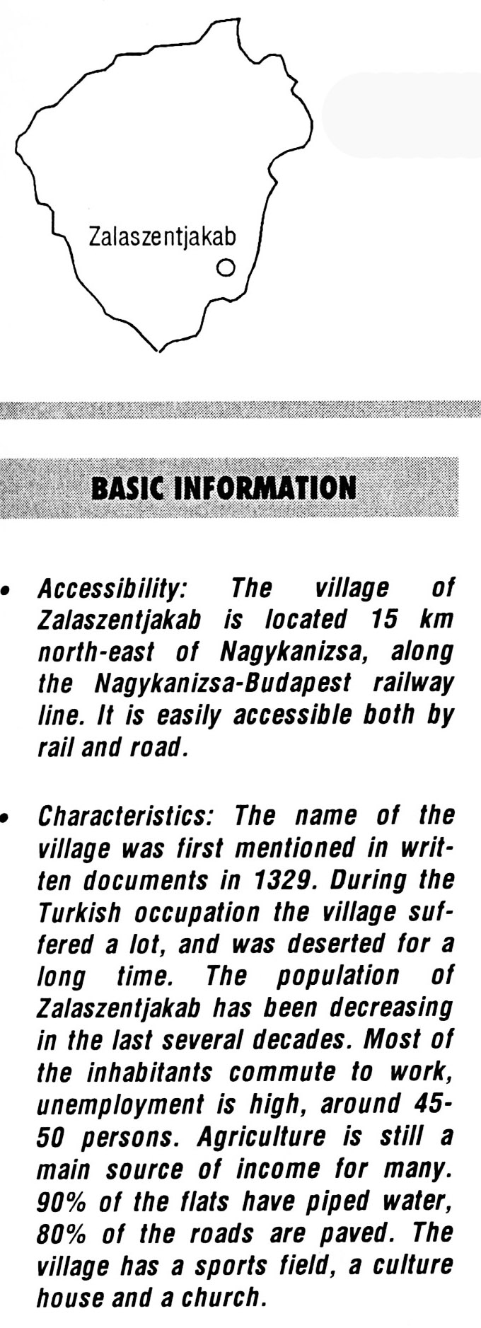 Nyilvános 1975 | 5591 | Zalaszentjakab | BASIC INFORMATION Accessibility: The village of Zalaszentjakab is located 15 km north-east of Nagykanizsa, along the Nagykanizsa-Budapest railway line. It is easily accessible both by rail and road. Characteristics: The name of the village was first mentioned in written documents in 1329. During the Turkish occupation the village suffered a lot, and was deserted for a long time. The population of Zalaszentjakab has been decreasing in the last several decades. Most of the inhabitants commute to work, unemployment is high, around 45-50 persons. Agriculture is still a main source of income for many. 90% of the flats have piped water, 80% of the roads are paved. The village has a sports field, a culture house and a church. This text came from the following book: Title: Handbook of Zala county (Zala megye kézikönyve) Series: County handbooks of Hungary (Magyarország megyei kézikönyvei) Chief editor: Hóbor József Publisher: (Hatvan), CEBA-Hungary Ltd, 1998 ETO: 908.439.121(035) ; 050.8(439.121) ISBN: 963-9089-18-2 Pages: 488-1040 p. Remark: Closed on: 1998. márc. 31. |