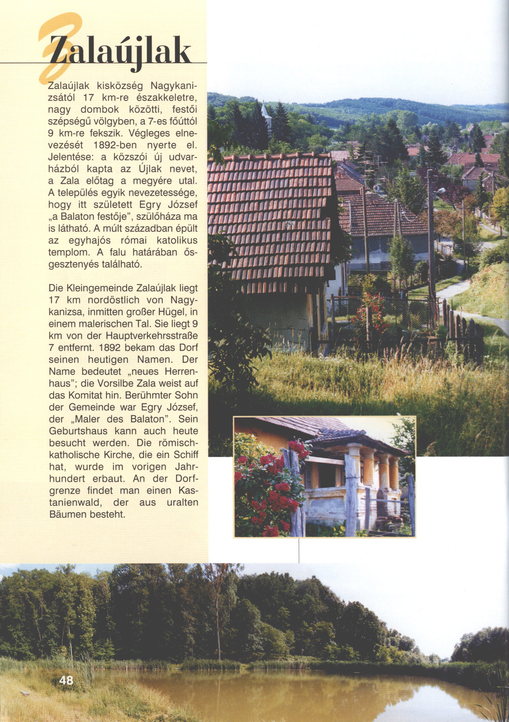 Nyilvános 2616 | 6553 | Zalaújlak | Die Kleingemeinde Zalaújlak liegt 17 km nordöstlich von Nagykanizsa, inmitten großer Hügel, in einem malerischen Tal. Sie liegt 9 km von der Hauptverkehrsstraße 7 entfernt. 1892 bekam das Dorf seinen heutigen Namen. Der Name bedeutet „neues Herrenhaus"; die Vorsilbe Zala weist auf das Komitat hin. Berühmter Sohn der Gemeinde war Egry József, der „Maler des Balaton". Sein Geburtshaus kann auch heute besucht werden. Die römischkatholische Kirche, die ein Schiff hat, wurde im vorigen Jahrhundert erbaut. An der Dorfgrenze findet man einen Kastanienwald, der aus uralten Bäumen besteht. Dieses Text stammt von: Titel: Hívogató a Régiók Kapujában - Útikönyv Látnivalók Nagykanizsán és Térségében (Einladend in dem Tor des Gebiets - Reisebuch - Sehenswürdigkeiten in Nagykanizsa und Umgebung) Herausgegeben von: Nagykanizsa és a Környező Települések Területfejlesztési Társulása (Verein für Gebietsentwicklung in Nagykanizsa und in ihrer Umgebung) 8800 Nagykanizsa, Petőfi Sándor út 5. Tel.: 06 93/536-453 • 06 93/536-454 Tel ./Fax: 06 93/326-323 E-mail: terstars@axelero.hu www.kanizsaterseg.celodin.hu |