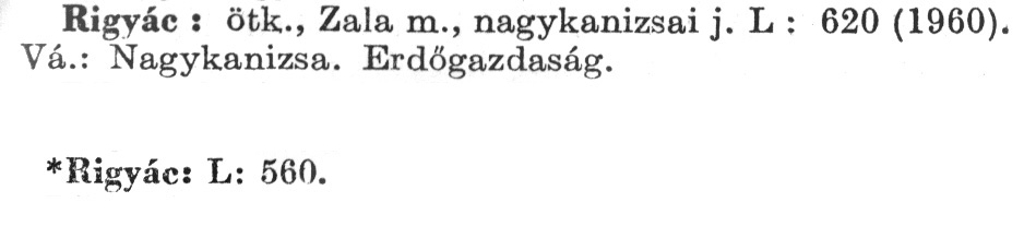 Nyilvános 2228 | 5944 | A szócikkek felismertetett szövege: | (Az első csillag után az 1972-es, a második csillag után az 1981-es kiadású kiegészítő kötetből származó szöveg következik) Rigyác: ötk., Zala m., nagykanizsai j. L: 620(1960). Vá.: Nagykanizsa. Erdőgazdaság. *Rigyác: L: 560. A szócikkek a következő lexikonból származnak: Cím: Új magyar lexikon Közreműködő: Berei Andor (1900-1979) (szerk.) Szerz. közl.: [szerk. Berei Andor et al.] Kiadás jelzés: 2. lny. Kiadás: Budapest : Akad. K., 1961-1962 Kötetei: 1., A - C 2., D - F 3., G - J 4., K - Me 5., Mf - R 6., S - Z 7. köt., A-Z Kiegészítő kötet (1972) Kiegészítő kötet, 1962÷1980 (1981) ETO jelzet: 03=945.11 Szakjelzet: 030 Cutter: U 28 Nyelv: magyar Megjegyzés: Bibliogr. a címszavak egy részének végén |