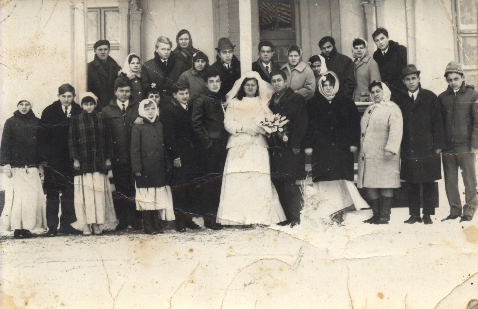 Nyilvános 1687 | 4053 | 1970-75 körül Baranyai Ibolya és Baranyai József esküvője - hátsó sor 3. Baranyai József 6. Csizmadia József, utolsó Horváth József. Első sor, a férjtől jobbra Horváth Rózsa, Horváth Istvánné, Horváth István és Horváth József. A kép a Kiskomáromi templom előtt készült. | |