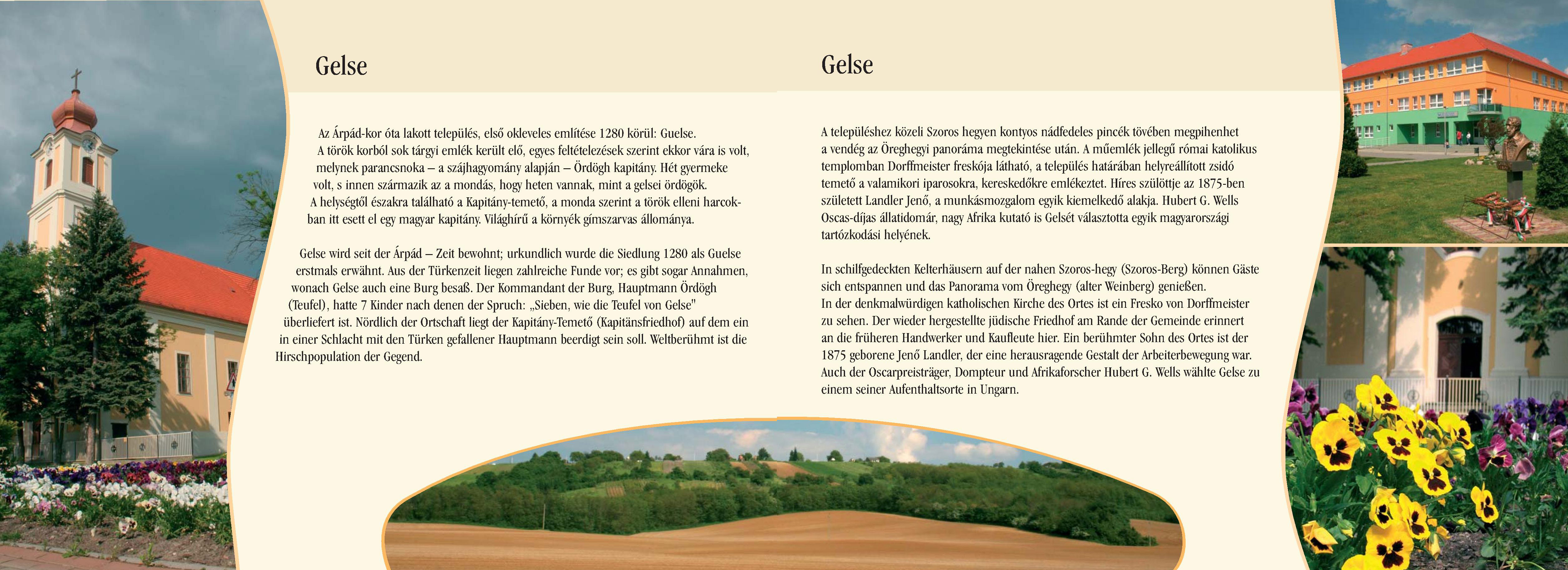 Nyilvános 2208 | 6612 | Gelse | Gelse wird seit der Árpád ¬ Zeit bewohnt; urkundlich wurde die Siedlung 1280 als Guelse erstmals erwähnt. Aus der Türkenzeit liegen zahlreiche Funde vor; es gibt sogar Annahmen, wonach Gelse auch eine Burg besaß. Der Kommandant der Burg, Hauptmann Ördögh (Teufel), hatte 7 Kinder nach denen der Spruch: ,,Sieben, wie die Teufel von Gelse" überliefert ist. Nördlich der Ortschaft liegt der Kapitány-Temető (Kapitänsfriedhof) auf dem ein in einer Schlacht mit den Türken gefallener Hauptmann beerdigt sein soll. Weltberühmt ist die Hirschpopulation der Gegend. In schilfgedeckten Kelterhäusern auf der nahen Szoros-hegy (Szoros-Berg) können Gäste sich entspannen und das Panorama vom Öreghegy (alter Weinberg) genießen. In der denkmalwürdigen katholischen Kirche des Ortes ist ein Fresko von Dorffmeister zu sehen. Der wieder hergestellte jüdische Friedhof am Rande der Gemeinde erinnert an die früheren Handwerker und Kaufleute hier. Ein berühmter Sohn des Ortes ist der 1875 geborene Jenő Landler, der eine herausragende Gestalt der Arbeiterbewegung war. Auch der Oscarpreisträger, Dompteur und Afrikaforscher Hubert G. Wells wählte Gelse zu einem seiner Aufenthaltsorte in Ungarn. Dieses Text stammt von: Pannonhát tájpark prospektus 2006. Web: http://www.pannonhat.hu/ (auch in Deutsch) |