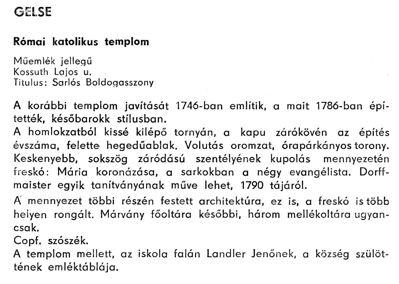 Nyilvános 1884 | 4143 | Gelse - Zala megye műemlékei 1979 070old | A részlet szövege: GELSE Római katolikus templom Műemlék jellegű Kossuth Lajos u. Titulus: Sarlós Boldogasszony A korábbi templom javítását 1746-ban említik, a mait 1786-ban építették, későbarokk stílusban. A homlokzatból kissé kilépő tornyán, a kapu zárókövén az építés évszáma, felette hegedűablak. Volutás oromzat, órapárkányos torony. Keskenyebb, sokszög záródású szentélyének kupolás mennyezetén freskó: Mária koronázása, a sarkokban a négy evangélista. Dorffmaister egyik tanítványának műve lehet, 1790 tájáról. A mennyezet többi részén festett architektúra, ez is, a freskó is több helyen rongált. Márvány főoltára későbbi, három mellékoltára ugyancsak. Copf. szószék. A templom mellett, az iskola falán Landler Jenőnek, a község szülöttének emléktáblája. A részlet a következő könyvből származik: Cím: Zala megye műemlékei Szerző: Németh József (1928) Közreműködő: Vándor László (szerk.) ; Szabóky Zsolt (1941) (fotó) Szerz. közl.: Németh József ; [szerk. Vándor László] ; [fotók... Szabóky Zsolt] Kiadás jelzés: 2. bőv. kiad. Kiadás: Zalaegerszeg : Zalai Ny., 1979 ETO jelzet: 72(439.121) ; 7.025.3/.4(439.121) ; 908.439.121 Tárgyszó: Zala Szakjelzet: 908 Cutter: N 53 Nyelv: magyar Oldalszám: 134 p. |