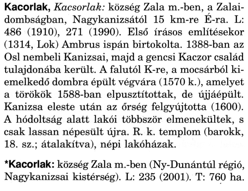 Nyilvános 2505 | 6747 | Rövid leírás | Teljes leírás (2.41 KB) | A szócikkek felismertetett szövege: (A csillag után a kiegészítő kötetből származó szöveg következik) Kacorlak, Kacsorlak: község Zala m.-ben, a Zalaidombságban, Nagykanizsától 15 km-re É-ra. L: 486 (1910), 271 (1990). Első írásos említésekor (1314, Lok) Ambrus ispán birtokolta. 1388-ban az Osl nembeli Kanizsai, majd a gencsi Kaczor család tulajdonába került. A falutól K-re, a mocsárból kiemelkedő dombra épült végvára (1570 k.), amelyet a törökök 1588-ban elpusztítottak, de újjáépült. Kanizsa eleste után az őrség felgyújtotta (1600). A hódoltság alatt lakói többször elmenekültek, s csak lassan népesült újra. R. k. templom (barokk, 18. sz.; átalakítva), népi lakóházak. *Kacorlak: község Zala m.-ben (Ny-Dunántúl régió, Nagykanizsai kistérség). L: 235 (2001). T: 760 ha. A szócikkek a következő lexikonból származnak: Cím: Magyar nagylexikon Közreműködő: Élesztős László (1949) (szerk.) ; Barabás Éva (1943) (szerk.) ; Berényi Gábor (1946) (szerk.) ; Bárány Lászlóné (szerk.) ; Adelmann-né Kertész Judit (1945) (közrem.) ; Froemel Károlyné Jáky Éva (1936) (közrem.) ; Akadémiai Kiadó és Nyomda Vállala Szerz. közl.: [... Élesztős László főszerk.] ; [szerk. Barabás Éva et al.] ; [bibliogr. Adelmanné Kertész Judit] ; [kész. az Akadémiai Kiadó Magyar Nagylexikon Szerkesztőségében] Kiadás: Budapest : Akad. K., 1993- Kötetei: 1. köt., A - Anc 2. köt., And - Bag 3. köt., Bah - Bij 4. köt., Bik - Bz 5. köt., C - Csem 6. köt., Csen - Ec 7. köt., Ed - Fe 8. köt., Ff - Gyep 9. köt., Gyer - Iq 10. köt., Ir - Kip 11. köt., Kir - Lem 12. köt., Len - Mep 13. köt., Mer - Nyk 14. köt., Nyl - Pom 15. köt., Pon - Sek 16. köt., Sel - Szö 17. köt., Szp - Ung 18. köt., Unh - Z 19. köt., Kiegészítő kötet, A - Z ETO jelzet: 030=945.11 Szakjelzet: 030 Cutter: M 14 ISBN: 963-05-6611-7 [!ISBN 963-05-6615-X] Nyelv: magyar Megjegyzés: Az 5. kötettől kiad. a Magyar Nagylexikon Kiadó ; A 6. kötettől főszerk. Berényi Gábor ; A 6. kötettől szakszerk. Bárány Lászlóné et al. ; A 6. kötettől bibliogr. Froemel Károlyné ; Bibliogr. a szócikkek végén |