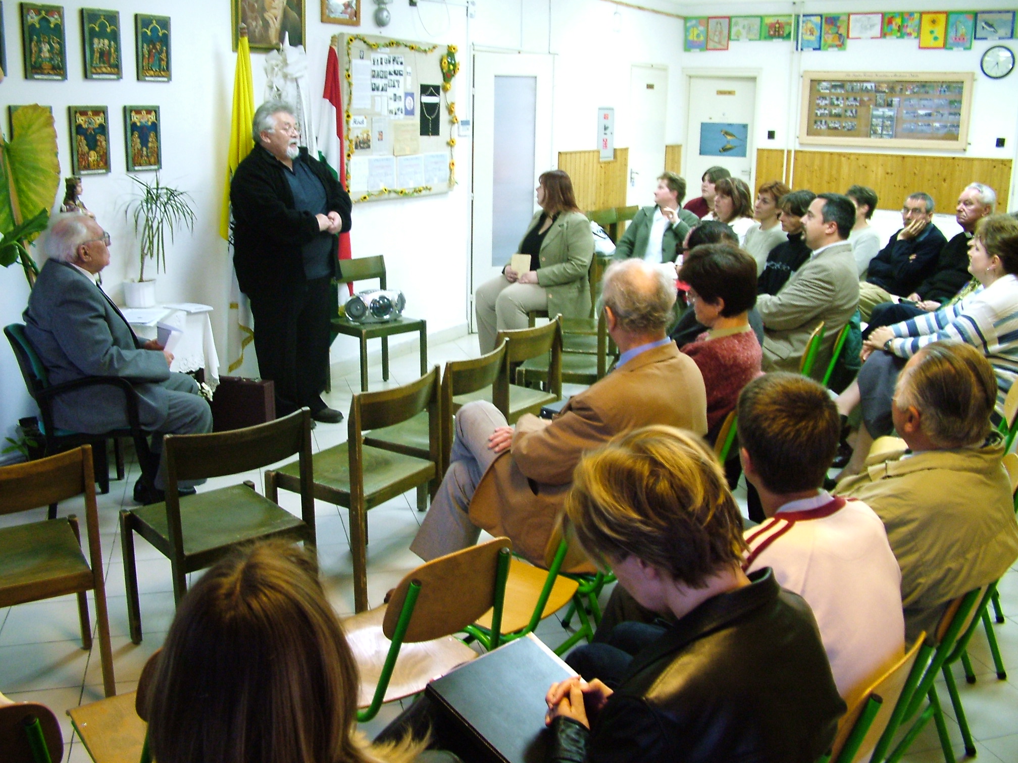 Nyilvános 1976 | 5455 | Tunyogi Csapó Gábor költő, irodalmi estje a zalaszabari Sík Sándor Katolikus Általános Iskola aulájában 2005-ben. A költőt nagykanizsai pályatársa Riersch Zolátn mutatta be. Tunyogi Csapó Gábor Kocsis Gábor álnéven a nyugati magyar irodalom jeles képviselője, a Nemzetőr első évfolyamainak szerkesztője volt, nyugdíjasként kötözött be a kies zalai faluba, Zalaszabarba, | |