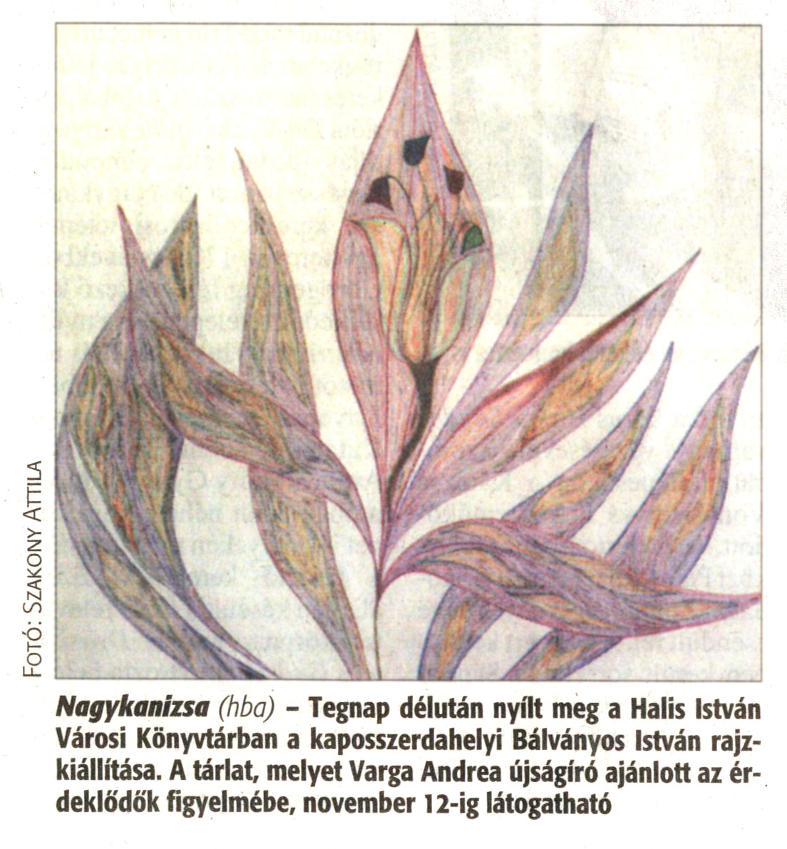 Nyilvános 1373 | 3452 | Zalai Hírlap 2008 11 03 256sz 16old - Bálványos István kiállítás | A cikk szövege: Nagykanizsa (hba) - Tegnap délután nyílt meg a Halis István Városi Könyvtárban a kaposszerdahelyi Bálványos István rajzkiállítása. A tárlat, melyet Varga Andrea újságíró ajánlott az érdeklődök figyelmébe, november 12-ig látogatható. |