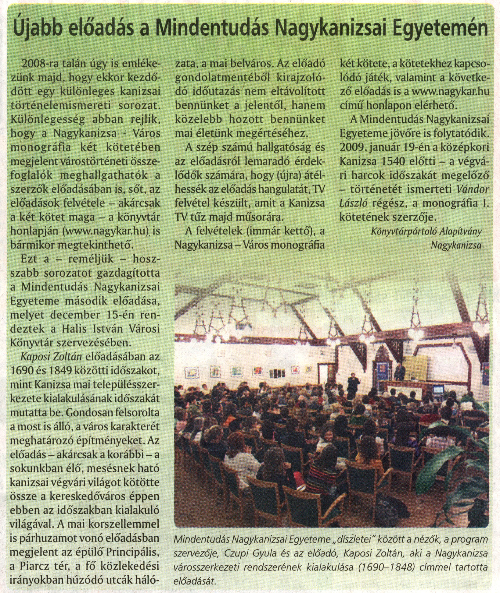 Nyilvános 2262 | 4073 | Nagykanizsai Maraton 2008. december 18. 50. szám 2. oldal | Újabb előadás a Mindentudás Nagykanizsai Egyetemén A cikk szövege: Újabb előadás a Mindentudás Nagykanizsai Egyetemén 2008-ra talán úgy is emlékezünk majd, hogy ekkor kezdődött egy különleges kanizsai történelemismereti sorozat. Különlegesség abban rejlik, hogy a Nagykanizsa - Város monográfia két kötetében megjelent várostörténeti összefoglalók meghallgathatók a szerzők előadásában is, sőt, az előadások felvétele - akárcsak a két kötet maga - a könyvtár honlapján (www.nagykar.hu). is bármikor megtekinthető. Ezt a - reméljük - hosszabb sorozatot gazdagította a Mindentudás Nagykanizsai Egyeteme második előadása, melyet december 15-én rendeztek a Halis István Városi Könyvtár szervezésében. Kaposi Zoltán előadásában az 1690 és 1849 közötti időszakot, mint Kanizsa mai településszerkezete kialakulásának időszakát mutatta be. Gondosan felsorolta a most is álló, a város karakterét meghatározó építményeket. Az előadás - akárcsak a korábbi - a sokunkban élő, mesésnek ható kanizsai végvári világot kötötte össze a kereskedőváros éppen ebben az időszakban kialakuló világával. A mai korszellemmel is párhuzamot vonó előadásban megjelent az épülő Principális, a Piarcz tér, a fő közlekedési irányokban húzódó utcák hálózata, a mai belváros. Az előadó gondolatmentéből kirajzolódó időutazás nem eltávolított bennünket a jelentől, hanem közelebb hozott bennünket mai életünk megértéséhez. A szép számú hallgatóság és az előadásról lemaradó érdeklődők számára, hogy (újra) átélhessék az előadás hangulatát, TV felvétel készült, amit a Kanizsa TV tűz majd műsorára. A felvételek (immár kettő), a Nagykanizsa - Város monográfia két kötete, a kötetekhez kapcsolódó játék, valamint a következő előadás is a www.nagykar.hu című honlapon elérhető. A Mindentudás Nagykanizsai Egyeteme jövőre is folytatódik. 2009. január 19-én a középkori Kanizsa 1540 előtti - a végvári harcok időszakát megelőző - történetét ismerteti Vándor László régész, a monográfia I. kötetének szerzője. Könyvtárpártoló Alapítvány Nagykanizsa Mindentudás Nagykanizsai Egyeteme „ díszletei" között a nézők, a program szervezője, Czupi Gyula és az előadó, Kaposi Zoltán, aki a Nagykanizsa városszerkezeti rendszerének kialakulása (1690-1848) címmel tartotta előadását. |