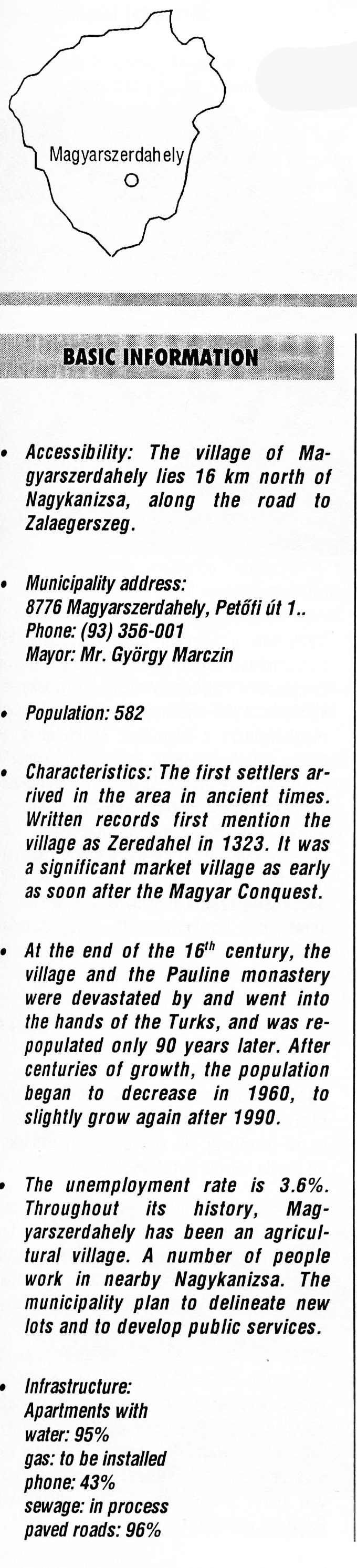 Nyilvános 2386 | 6619 | Magyarszerdahely | BASIC INFORMATION Accessibility: The village of Magyarszerdahely lies 16 km north of Nagykanizsa, along the road to Zalaegerszeg. Municipality address: 8776 Magyarszerdahely, Petőfi út 1. Phone: (93) 356-001 Mayor: Mr. György Marczin Population: 582 Characteristics: The first settlers arrived in the area in ancient times. Written records first mention the village as Zeredahel in 1323. It was a significant market village as early as soon after the Magyar Conquest. At the end of the 16th century, the village and the Pauline monastery were devastated by and went into the hands of the Turks, and was repopulated only 90 years later. After centuries of growth, the population began to decrease in 1960, to slightly grow again after 1990. The unemployment rate is 3.6%. Throughout its history, Magyarszerdahely has been an agricultural village. A number of people work in nearby Nagykanizsa. The municipality plan to delineate new lots and to develop public services. Infrastructure: Apartments with water: 95% gas: to be installed phone: 43% sewage: in process paved roads: 96% This text came from the following book: Title: Handbook of Zala county (Zala megye kézikönyve) Series: County handbooks of Hungary (Magyarország megyei kézikönyvei) Chief editor: Hóbor József Publisher: (Hatvan), CEBA-Hungary Ltd, 1998 ETO: 908.439.121(035) ; 050.8(439.121) ISBN: 963-9089-18-2 Pages: 488-1040 p. Remark: Closed on: 1998. márc. 31. |