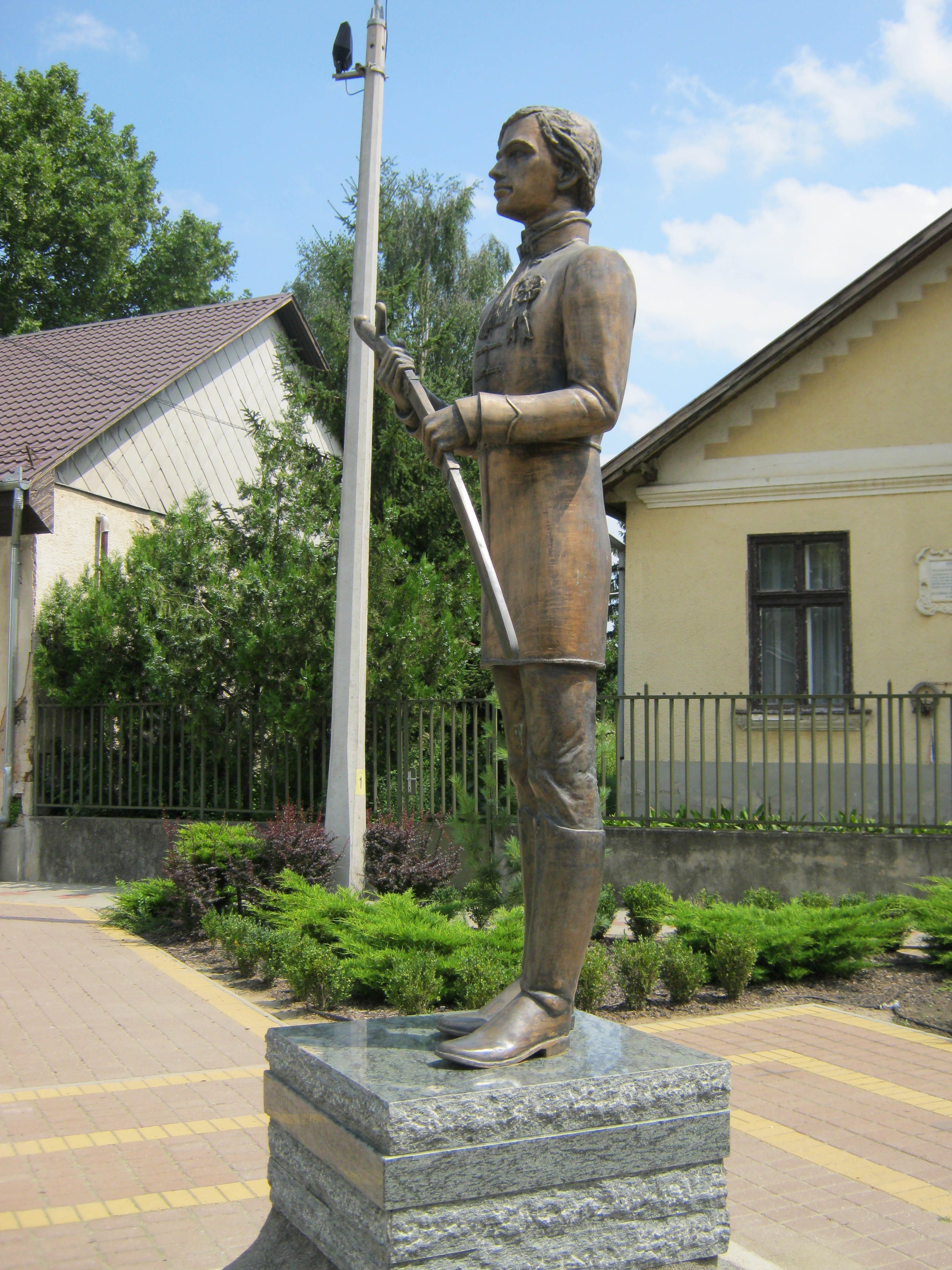 Nyilvános 1038 | 1603 | Nagykálló, Szabadság tér 6. előtt: Márciusi Ifjú szobra | Korányi Frigyes szülőháza előtt állították fel 2006-ban Nagy Lajos Imre: Márciusi ifjú című egészalakos szobrát annak emlékére, hogy 1848. szeptember 11-én 1200 ifjú önkéntes tett esküt Nagykálló főterén. A szobor Korányi szülőháza előtt állva emlékeztet arra is, hogy Korányi Frigyes maga is részt vett a szabadságharcban. Felh. irod.: Harsányi Gézáné: Kálló kincsei. Nagykálló, 2007 A fénykép 2010 augusztus elején készült |