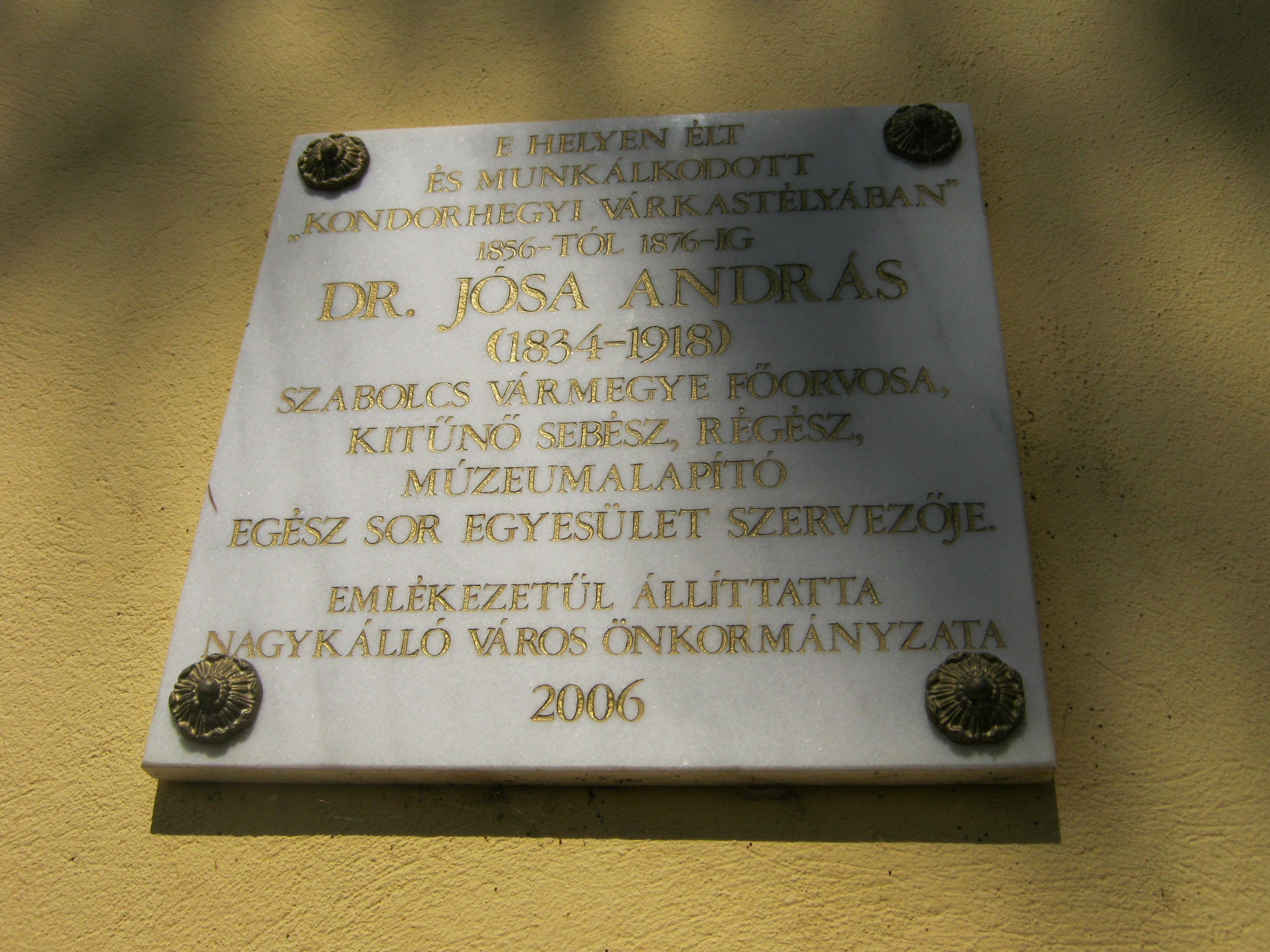 Nyilvános 1041 | 1404 | Nagykálló, Somogyi B. út 5-7. | Ma a Polgármesteri Hivatal működik itt, ahol egykor dr. Jósa András orvos, múzeumlapító élt. Jósa fiatal orvosként az 1860-as évek közepén telepedett le Nagykállóban, ahol Korányi Frigyes örökébe lépett. Nagykállóhoz erős családi kötelékek is fűzték: egyik őse kállói várkapitány volt, apai nagyapja pedig a vármegye első főorvosa. Dr. Jósa két évtizedet töltött itt legendássá váló gyakorló orvosként. Itt alapított családot: hat leánya született, akiket "orgonasípok"-nak nevezett :). Házasságkötése után vásárolta meg ezt az azóta átépített kúriát, amelyet - Nagykálló e részének neve után - tréfásan kondorhegyi várkastélyaként emlegetett. Rendkívül széles egyéniségű és sokoldalú ember volt. Hogy kórházának pénzt szerezzen, felvirágoztatta a településen a műkedvelő színjátszást. Mellette fúrt-faragott, később beletanult a régészeti kutatásokba. Amikor a vármegye székhelyét Nyíregyházára tették át, ő is odaköltözött (lásd: Nyíregyháza, Malom utca 3.). Felh. irod.: Harsányi Gézáné: Kálló kincsei. Nagykálló, 2007 Harsányi Gézáné: Nagykálló porában. Dr. Jósa András nyomában. = A nyíregyházi Jósa András Múzeum évkönyve 2008 |