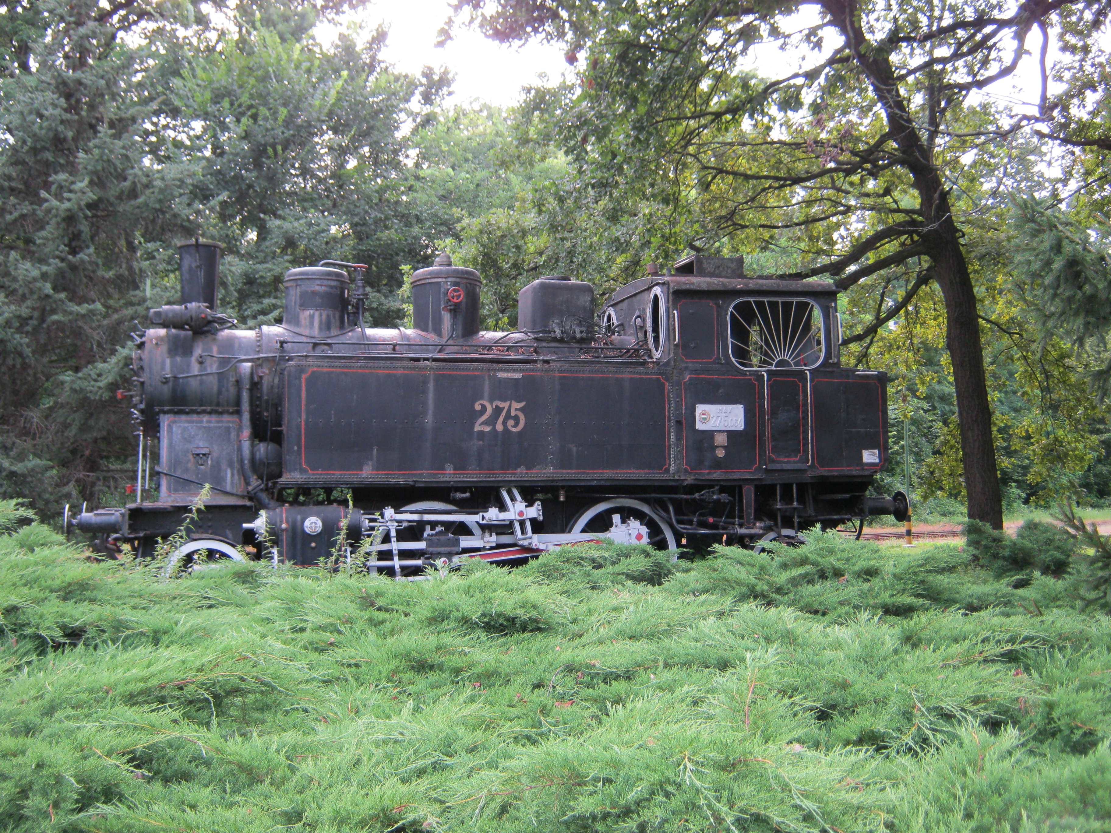 Nyilvános 1370 | 4268 | Nyíregyháza-Sóstó, Vasútállomás | Sóstófürdő központjában ma étteremként üzemel a régi vasútállomás műemlékké nyilvánított épülete. 1911-ben ezt is Pazár István tervezte, eklektikus stílusban. Közelében a kisvasút egyik régi mozdonya is látható. A fénykép 2010 augusztus elején készült |