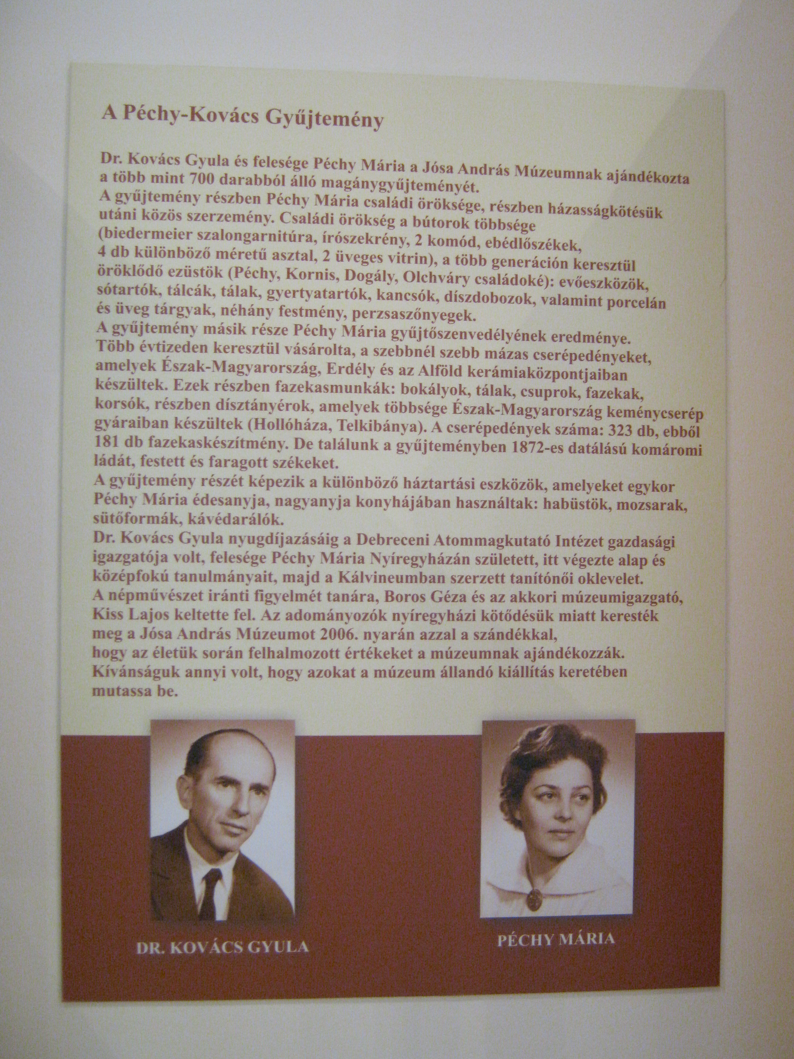 Nyilvános 1372 | 1956 | Nyíregyháza, Benczúr tér 21. Jósa András Múzeum | Magyarország egyik legrégibb múzeumát Dr. Jósa András alapította 1868-ban, akinek ma nevét viseli. Egyik állandó kiállítása a Péchy - Kovács-gyűjtemény, dr. Kovács Gyula és felesége, Péchy Mária több, mint 700 darabból álló magánygyűjteménye. Dr. Kovács Gyula nyugdíjazásáig a Debreceni Atommagkutató Intézet gazdasági igazgatója volt, felesége tanítónő. A gyűjtemény egyik részét bútorok (biedermeier szalongarnitúra, ebédlőszékek, írószekrény stb.) és ezüst evőeszközök, tálcák, gyertyatartók és más tárgyak, valamint festmények és perzsaszőnyegek alkotják. A másik rész Péchy Mária gyűjtőszenvedélyének eredménye, aki több évtizeden keresztül vásárolta, a szebbnél szebb mázas cserépedényeket, amelyek Észak-Magyarország, Erdély és az Alföld kerámiaközpontjaiban készültek. Vannak itt különböző háztartási eszközök, amelyeket egykor Péchy Mária édesanyja, nagyanyja használt: habüstök, mozsarak, sütőformák, kávédarálók. Felh. irod.: Látnivalók Szabolcs-Szatmár-Bereg megyében. Miskolc, Well-PRess, 1999 http://jam.nyirbone.hu A fénykép 2010 augusztus elején készült. |