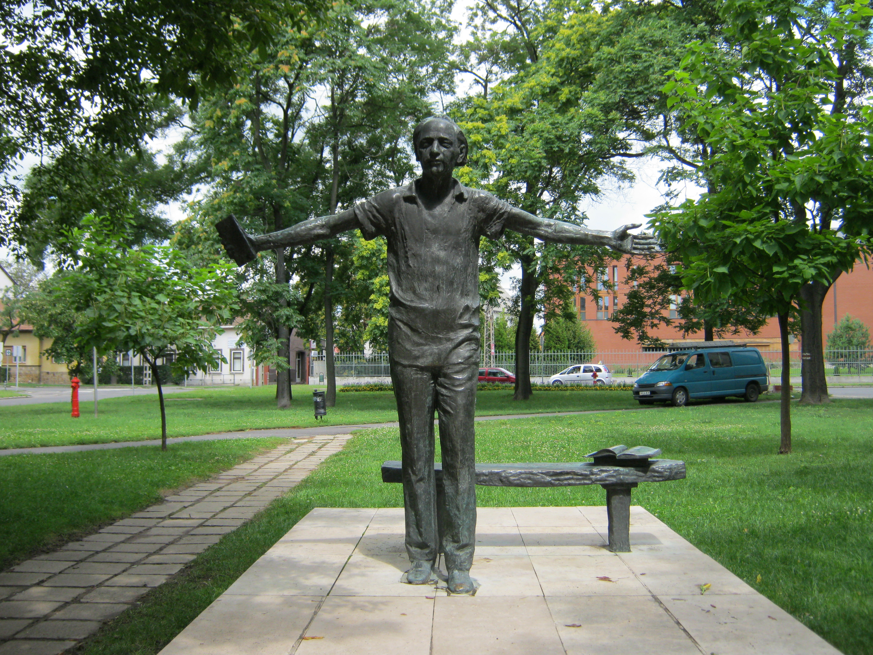 Nyilvános 1137 | 3671 | Nyíregyháza, Bessenyei tér: Váci Mihály szobra | A Bessenyei téren, a Móricz Zsigmond Színház közelében 1976-ban állították fel Váci Mihály költő szobrát, ifj. Szabó István alkotását. Váci Mihály (1924-1970) Nyíregyházán született és nevelkedett (lásd: Nyíregyháza, Bartók B. u. 32.) és itt végezte el a tanítóképző intézetet (lásd: Nyíregyháza, Széchenyi u. 6.). Felh. irod.: Látnivalók Szabolcs-Szatmár-Bereg megyében. Miskolc, Well-PRess, 1999 A fénykép 2010 augusztus elején készült. |