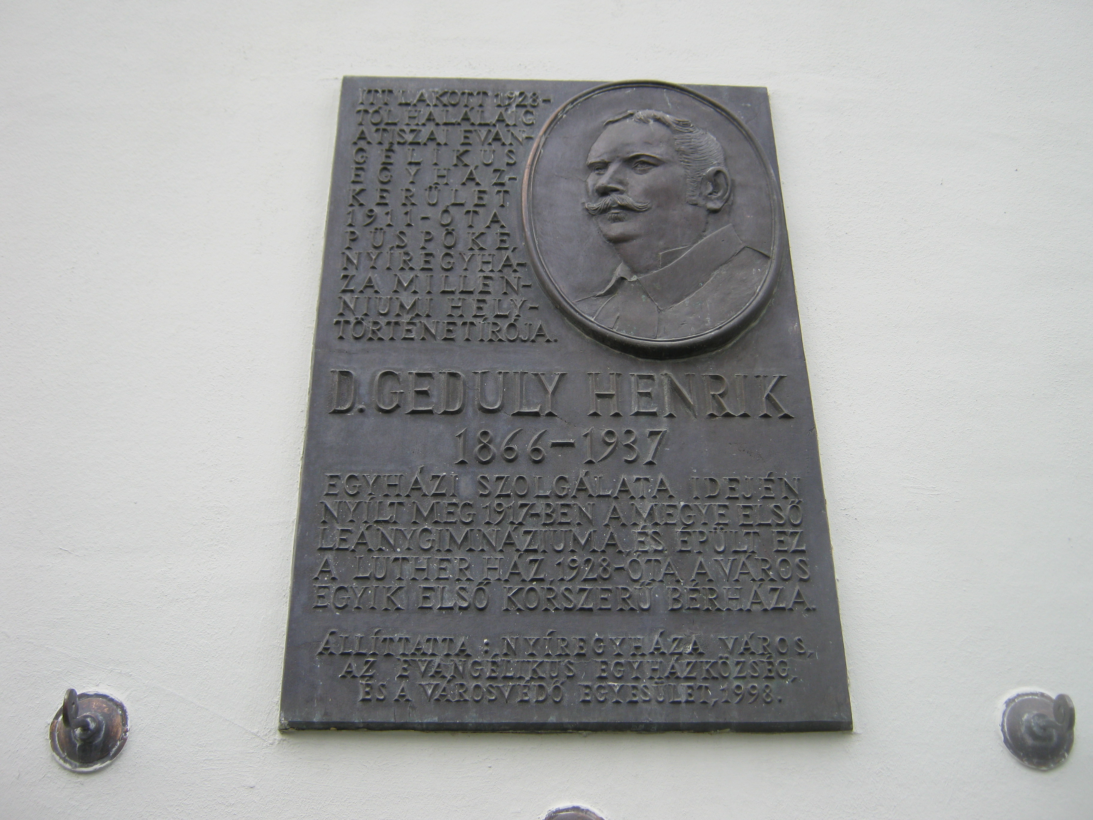 Nyilvános 1039 | 1569 | Nyíregyháza, Luther utca 5. | Az épület egy másik táblája Geduly Henrik emlékét örökíti meg. A Tiszai Evangélikus Egyházkerület püspöke itt lakott, az általa 1928-ban építtetett házban. Ez volt Nyíregyháza első korszerű bérháza. Geduly egyházi működése mellett 1896-ban megírta a "Nyíregyháza az ezredik évben" című városmonográfiát. Ő alapította a leánygimnáziumot és tevékenyen részt vett a város kulturális és társadalmi életében. Sírja az Északi temetőben (lásd: Pazonyi tér 5.) található. Felh. irod.: http://www.lutheran.hu/z/ujsagok/evelet/archivum/2007/07/103 A fénykép 2010 augusztus elején készült. |