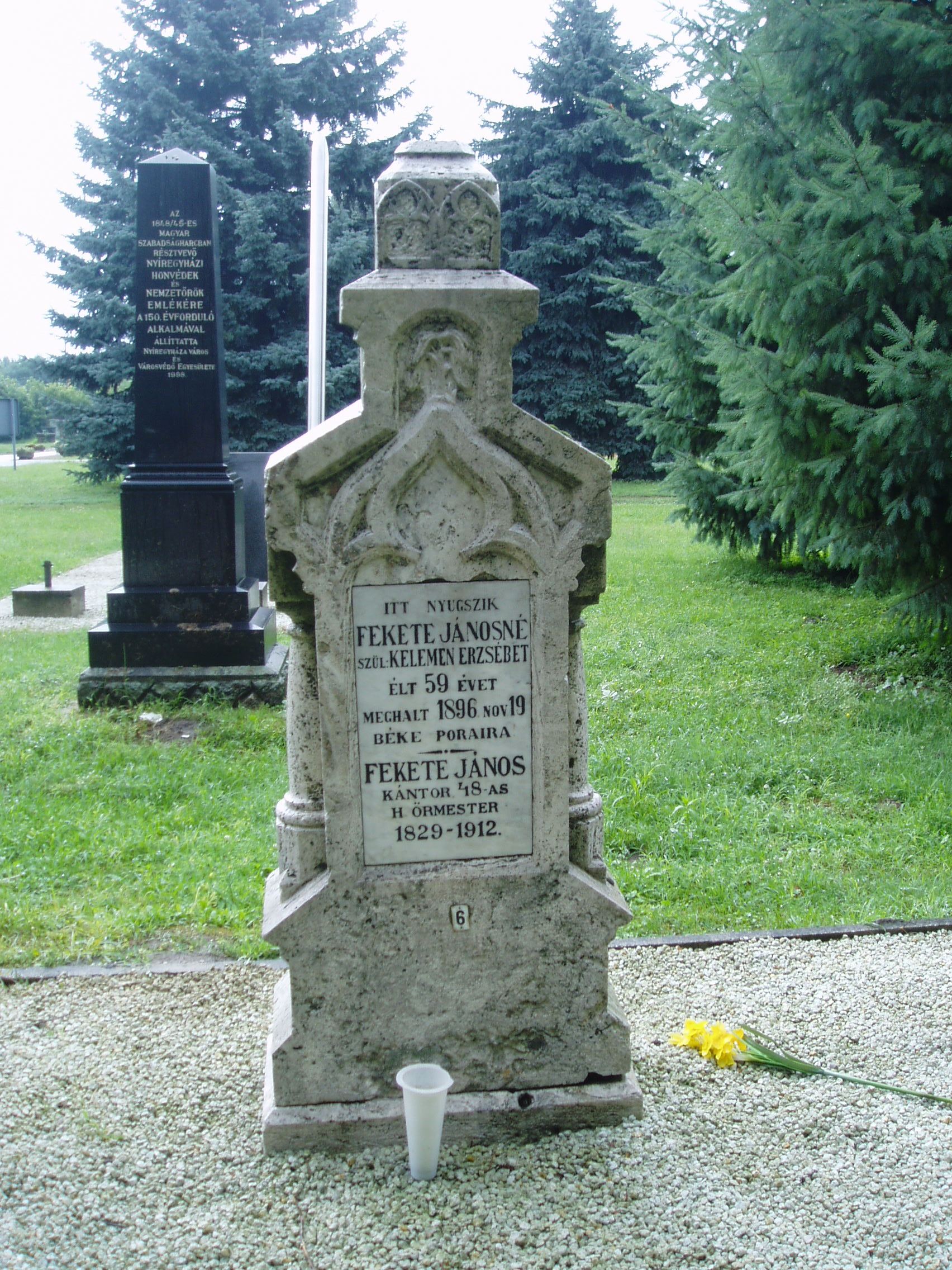 Nyilvános 1106 | 1719 | Nyíregyháza, Pazonyi tér, Északi temető: Fekete János | A Dózsa György út vezet Nyíregyháza Északi temetőjébe. A ravatalozó közelében, a díszsírhelyek között találjuk Fekete János (1829-1912) kántor, 1848-as honvéd őrmester sírkövét. Felh. irod.: Fazekas Árpád - Szekrényes András: Nyíregyháza temetői. Nyíregyháza, 1990 A fénykép 2010 augusztus elején készült |