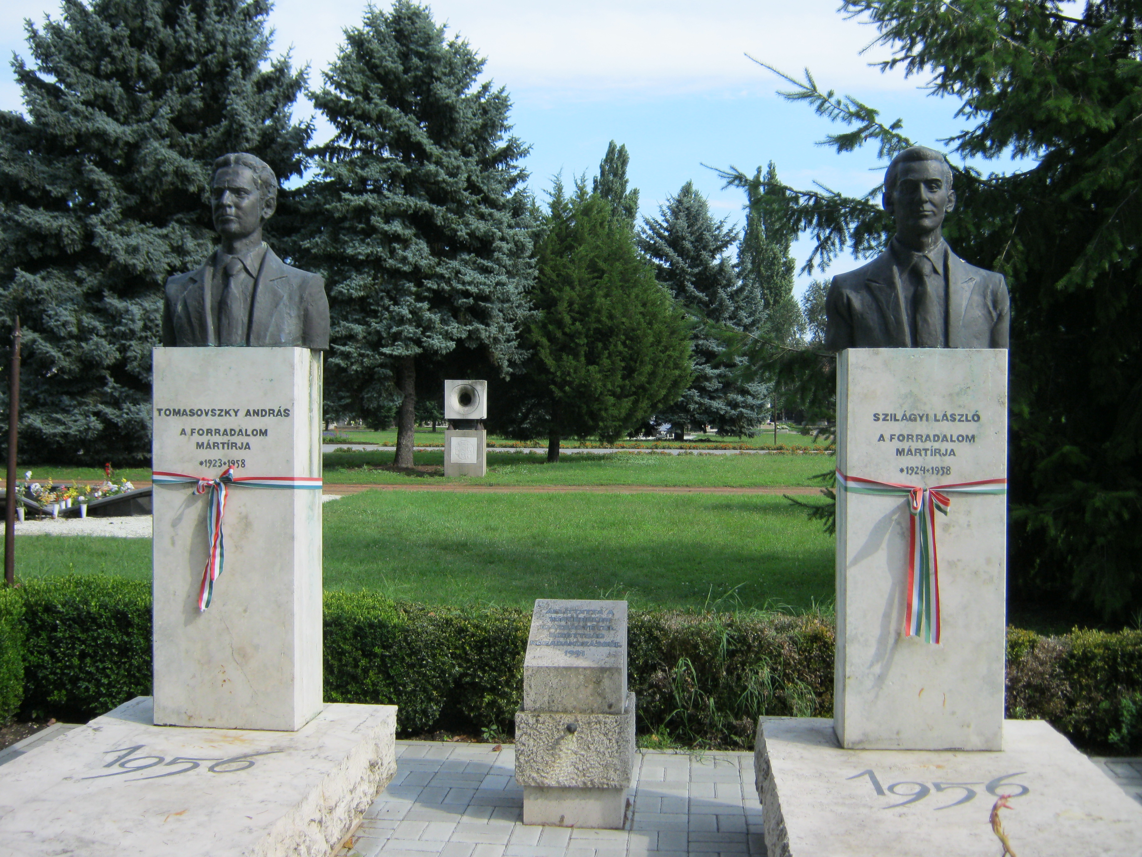 Nyilvános 1136 | 2824 | Nyíregyháza, Pazonyi tér, Északi temető: Tomasovszky András és Szilágyi László | A Dózsa György út vezet Nyíregyháza Északi temetőjébe. Központi részén temették újra az 1956-os forradalom két mártírját, Tomasovszky Andrást és Szilágyi Lászlót. Tomasovszky András (Alma-Ata, 1923. 12. 22. - Nyíregyháza, 1958. 05. 06.) 1956-ban villanyszerelőként dolgozott. Október 26-án az Irodaház tetején a levert vörös csillag helyére kitűzte a nemzeti lobogót, majd egy másik zászlóval a Kossuth Gimnáziumba induló tömeg élére állt. Jelen volt a szovjet hősi emlékmű, Malinovszkij lovasszobrának a ledöntésénél is. A szobor talapzatán fölolvasta a miskolci forradalmárok ötpontos követelését, melyet aztán tízezer példányban kinyomtattak. Az ennek alapján Szilágyi László által megfogalmazott táviratot ő adta föl Nagy Imrének. Délután jelen volt a munkástanács megválasztásánál. Szilágyi László őt bízta meg a hírszerző csoport vezetésével. A határmenti községekkel állandó telefonos összeköttetést tartott, így tájékoztatta a szovjet csapatmozgásokról a forradalmi szerveket. 1957-ben a nyíregyházi járásbíróság fegyverrejtegetés vádjával három hónap börtönbüntetésre ítélte. Két testvére, a szovjet hadsereg tisztjei, hiába jártak közben az érdekében. 1957. áprilisában újra letartóztatták. A Debreceni Katonai Bíróság tanácsa szervezkedés kezdeményezése vádjával 1957. decemberében első fokon halálra ítélte, majd az ítéletet 1958 április végén jogerőre emelték. Május 6-án Nyíregyházán végezték ki Szilágyi Lászlóval együtt. Szilágyi László (Gégény, 1924. 11. 20. - Nyíregyháza, 1958. 05. 06.) 1956-ban vállalati tervelőadóként dolgozott Nyíregyházán. Október 26-án választották meg a Munkástanács elnökének, majd 29-én a Megyei Munkástanács elnökének. Szervezőkészségének, higgadt magatartásának volt nagyrészt köszönhető, hogy a megyében sikerült megőrizni a nyugalmat, hogy nem folyt vér. Ezt 1956 novemberében szovjet letartóztatói is elismerték, s elengedték. A magyar hatóságok 1957. február 21-én tartóztatták le. Ekkortól kezdve sorsa egybefonódott Tomasovszky Andráséval, egyazon tárgyaláson ítélték őket halálra első, majd másodfokon, s egyszerre végezték ki őket a nyíregyházai börtön udvarán. A mártírokat eredetileg e temető 28-as parcellájában jeltelen sírba helyezték. Mai síremléküket Tóth Sándor készítette 1991-ben. Felh. irod.: http://beszelamarvany.lapunk.hu/?modul=oldal&tartalom=1034286 A fénykép 2010 augusztus elején készült |