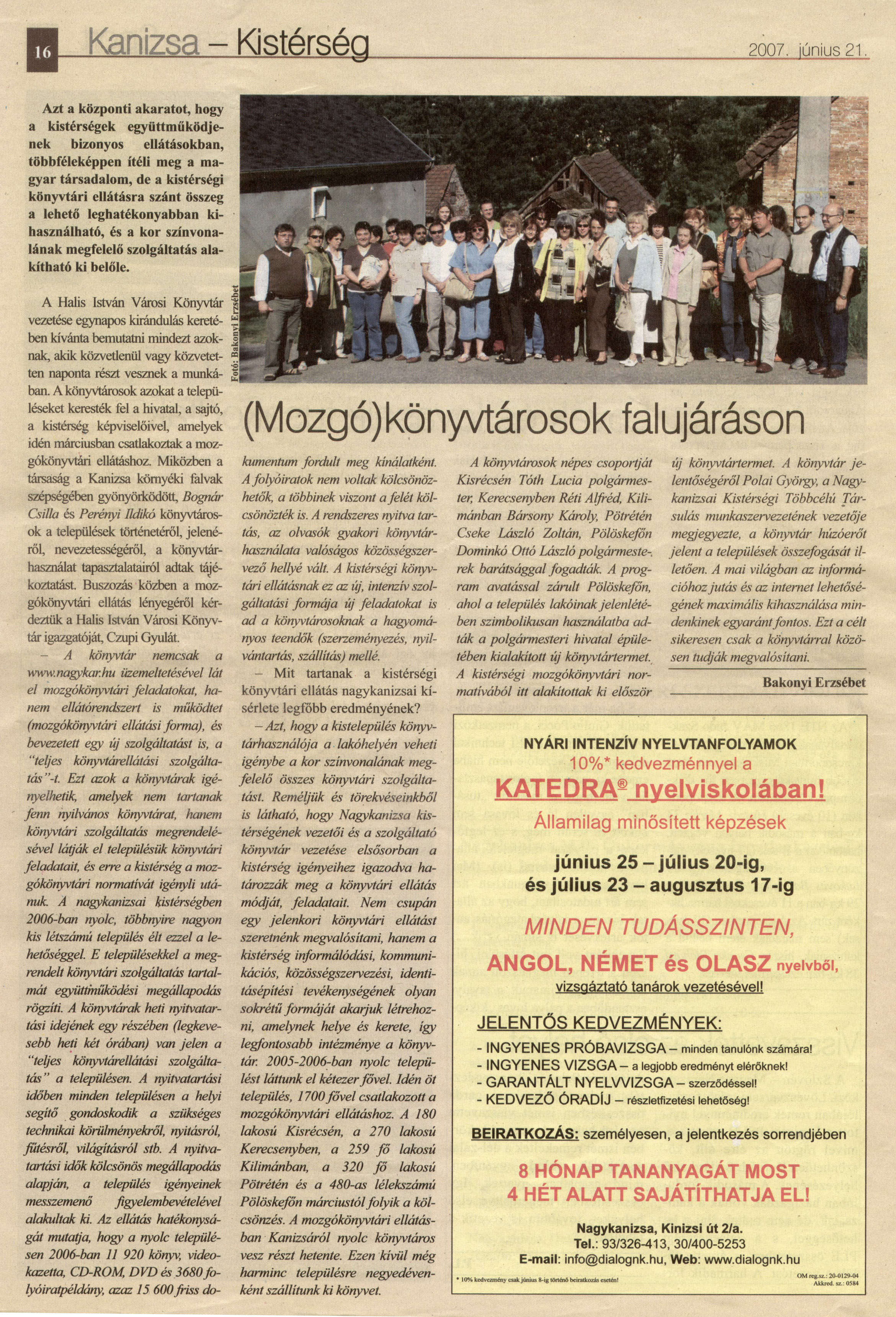 Nyilvános 2174 | 4833 | Kanizsa 2007 06 21 025sz 16old | (Mozgó)könyvtárosok falujáráson Kanizsa - Kistérség 2007. június 21. Azt a központi akaratot, hogy a kistérségek együttműködjenek bizonyos ellátásokban, többféleképpen ítéli meg a magyar társadalom, de a kistérségi könyvtári ellátásra szánt összeg a lehető leghatékonyabban kihasználható, és a kor színvonalának megfelelő szolgáltatás alakítható ki belőle. A Halis István Városi Könyvtár vezetése egynapos kirándulás keretében kívánta bemutatni mindezt azoknak, akik közvetlenül vagy közvetetten naponta részt vesznek a munkában. A könyvtárosok azokat a településeket keresték fel a hivatal, a sajtó, a kistérség képviselőivel, amelyek idén márciusban csatlakoztak a mozgókönyvtári ellátáshoz. Miközben a társaság a Kanizsa környéki falvak szépségében gyönyörködött, Bognár Csilla és Perényi Ildikó könyvtárosok a települések történetéről, jelenéről, nevezetességéről, a könyvtárhasználat tapasztalatairól adtak tájékoztatást. Buszozás közben a mozgókönyvtári ellátás lényegéről kérdeztük a Halis István Városi Könyvtár igazgatóját, Czupi Gyulát. – A könyvtár nemcsak a www.nagykar.hu üzemeltetésével lát el mozgókönyvtári feladatokat, hanem ellátórendszert is működtet (mozgókönyvtári ellátási forma), és bevezetett egy új szolgáltatást is, a „teljes könyvtárellátási szolgáltatás”-t. Ezt azok a könyvtárak igényelhetik, amelyek nem tartanak fenn nyilvános könyvtárat, hanem könyvtári szolgáltatás megrendelésével látják el településük könyvtári feladatait, és erre a kistérség a mozgókönyvtári normatívát igényli utánuk. A nagykanizsai kistérségben 2006-ban nyolc, többnyire nagyon kis létszámú település élt ezzel a lehetőséggel. E településekkel a megrendelt könyvtári szolgáltatás tartalmát együttműködési megállapodás rögzíti. A könyvtárak heti nyitvatartási idejének egy részében (legkevesebb heti két órában) van jelen a „teljes könyvtárellátási szolgáltatás” a településen. A nyitvatartási időben minden településen a helyi segítő gondoskodik a szükséges technikai körülményekről, nyitásról, fűtésről, világításról stb. A nyitvatartási idők kölcsönös megállapodás alapján, a település igényeinek messzemenő figyelembevételével alakultak ki. Az ellátás hatékonyságát mutatja, hogy a nyolc településen 2006-ban 11 920 könyv, videokazetta, CD-ROM, DVD és 3680 folyóiratpéldány, azaz 15 600 friss dokumentum fordult meg kínálatként. A folyóiratok nem voltak kölcsönözhetők, a többinek viszont a felét kölcsönözték is. A rendszeres nyitva tartás, az olvasók gyakori könyvtárhasználata valóságos közösségszervező hellyé vált. A kistérségi könyvtári ellátásnak ez az új, intenzív szolgáltatási formája új feladatokat is ad a könyvtárosoknak a hagyományos teendők (szerzeményezés, nyilvántartás, szállítás) mellé. – Mit tartanak a kistérségi könyvtári ellátás nagykanizsai kísérlete legfőbb eredményének? – Azt, hogy a kistelepülés könyvtárhasználója a lakóhelyén veheti igénybe a kor színvonalának megfelelő összes könyvtári szolgáltatást. Reméljük és törekvéseinkből is látható, hogy Nagykanizsa kistérségének vezetői és a szolgáltató könyvtár vezetése elsősorban a kistérség igényeihez igazodva határozzák meg a könyvtári ellátás módját, feladatait. Nem csupán egy jelenkori könyvtári ellátást szeretnénk megvalósítani, hanem a kistérség informálódási, kommunikációs, közösségszervezési, identitásépítési tevékenységének olyan sokrétű formáját akarjuk létrehozni, amelynek helye és kerete, így legfontosabb intézménye a könyvtár. 2005-2006-ban nyolc települést láttunk el kétezer fővel. Idén öt település, 1700 fővel csatlakozott a mozgókönyvtári ellátáshoz. A 180 lakosú Kisrécsén, a 270 lakosú Kerecsenyben, a 259 fő lakosú Kilimánban, a 320 fő lakosú Pötrétén és a 480-as lélekszámú Pölöskefőn márciustól folyik a kölcsönzés. A mozgókönyvtári ellátásban Kanizsáról nyolc könyvtáros vesz részt hetente. Ezen kívül még harminc településre negyedévenként szállítunk ki könyvet. A könyvtárosok népes csoportját Kisrécsén Tóth Lucia polgármester, Kerecsenyben Réti Alfréd, Kilimánban Bársony Károly, Pötrétén Cseke László Zoltán, Pölöskefőn Dominkó Ottó László polgármesterek barátsággal fogadták. A program avatással zárult Pölöskefőn, ahol a település lakóinak jelenlétében szimbolikusan használatba adták a polgármesteri hivatal épületében kialakított új könyvtártermet. A kistérségi mozgókönyvtári normatívából itt alakítottak ki először új könyvtártermet. A könyvtár jelentőségéről Polai György, a Nagykanizsai Kistérségi Többcélú Társulás munkaszervezetének vezetője megjegyezte, a könyvtár húzóerőt jelent a települések összefogását illetően. A mai világban az információhoz jutás és az internet lehetőségének maximális kihasználása mindenkinek egyaránt fontos. Ezt a célt sikeresen csak a könyvtárral közösen tudják megvalósítani. Bakonyi Erzsébet |