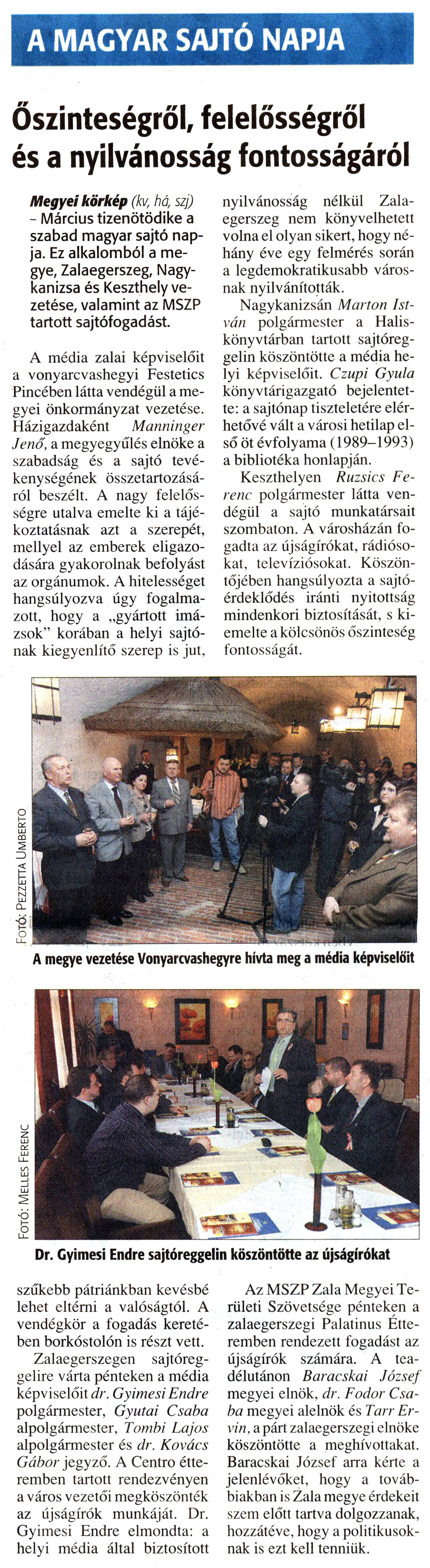 Nyilvános 1326 | 2743 | Zalai Hírlap 2008. március 17. 64. szám 4. oldal - A Magyar Sajtó Napja | A cikkben említett "városi hetilap első öt évfolyama (1989-1993)" a Kanizsa - Dél-Zalai Hetilap első öt évfolyamát jelenti. Elérhető a következő link mögött: http://www.nagykar.hu/ekonyvek/451.html Ugyanitt válik elérhetővé a lap minden további digitalizált példánya. Az eseményről, melyről a Zalai Hírlap tudósít, további képek találhatók a következő link mögött: http://www.nagykar.hu/keptar/2907.html A MAGYAR SAJTÓ NAPJA Őszinteségről, felelősségről és a nyilvánosság fontosságáról Megyei körkép (kvr há, szj) - Március tizenötödike a szabad magyar sajtó napja. Ez alkalomból a megye, Zalaegerszeg, Nagykanizsa és Keszthely vezetése, valamint az MSZP tartott sajtófogadást. A média zalai képviselőit a vonyarcvashegyi Festetics Pincében látta vendégül a megyei önkormányzat vezetése. Házigazdaként Manninger Jenő, a megyegyűlés elnöke a szabadság és a sajtó tevékenységének összetartozásáról beszélt. A nagy felelősségre utalva emelte ki a tájékoztatásnak azt a szerepét, mellyel az emberek eligazodására gyakorolnak befolyást az orgánumok. A hitelességet hangsúlyozva úgy fogalmazott, hogy a „gyártott imázsok" korában a helyi sajtónak kiegyenlítő szerep is jut, szűkebb pátriánkban kevésbé lehet eltérni a valóságtól. A vendégkör a fogadás keretében borkóstolón is részt vett. Zalaegerszegen sajtóreggelire várta pénteken a média képviselőit dr. Gyimesi Endre polgármester, Gyutai Csaba alpolgármester, Tombi Lajos alpolgármester és dr. Kovács Gábor jegyző. A Centro étteremben tartott rendezvényen a város vezetői megköszönték az újságírók munkáját. Dr. Gyimesi Endre elmondta: a helyi média által biztosított nyilvánosság nélkül Zalaegerszeg nem könyvelhetett volna el olyan sikert, hogy néhány éve egy felmérés során a legdemokratikusabb városnak nyilvánították. Nagykanizsán Marton István polgármester a Halis-könyvtárban tartott sajtóreggelin köszöntötte a média helyi képviselőit. Czupi Gyula könyvtárigazgató bejelentette: a sajtónap tiszteletére elérhetővé vált a városi hetilap első öt évfolyama (1989-1993) a bibliotéka honlapján. Keszthelyen Ruzsics Ferenc polgármester látta vendégül a sajtó munkatársait szombaton. A városházán fogadta az újságírókat, rádiósokat, televíziósokat. Köszöntőjében hangsúlyozta a sajtóérdeklődés iránti nyitottság mindenkori biztosítását, s kiemelte a kölcsönös őszinteség fontosságát. Az MSZP Zala Megyei Területi Szövetsége pénteken a zalaegerszegi Palatínus Étteremben rendezett fogadást az újságírók számára. A teadélutánon Baracskai József megyei elnök, dr. Fodor Csaba megyei alelnök és Tarr Er-vin, a párt zalaegerszegi elnöke köszöntötte a meghívottakat. Baracskai József arra kérte a jelenlévőket, hogy a továbbiakban is Zala megye érdekeit szem előtt tartva dolgozzanak, hozzátéve, hogy a politikusoknak is ezt kell tenniük. |