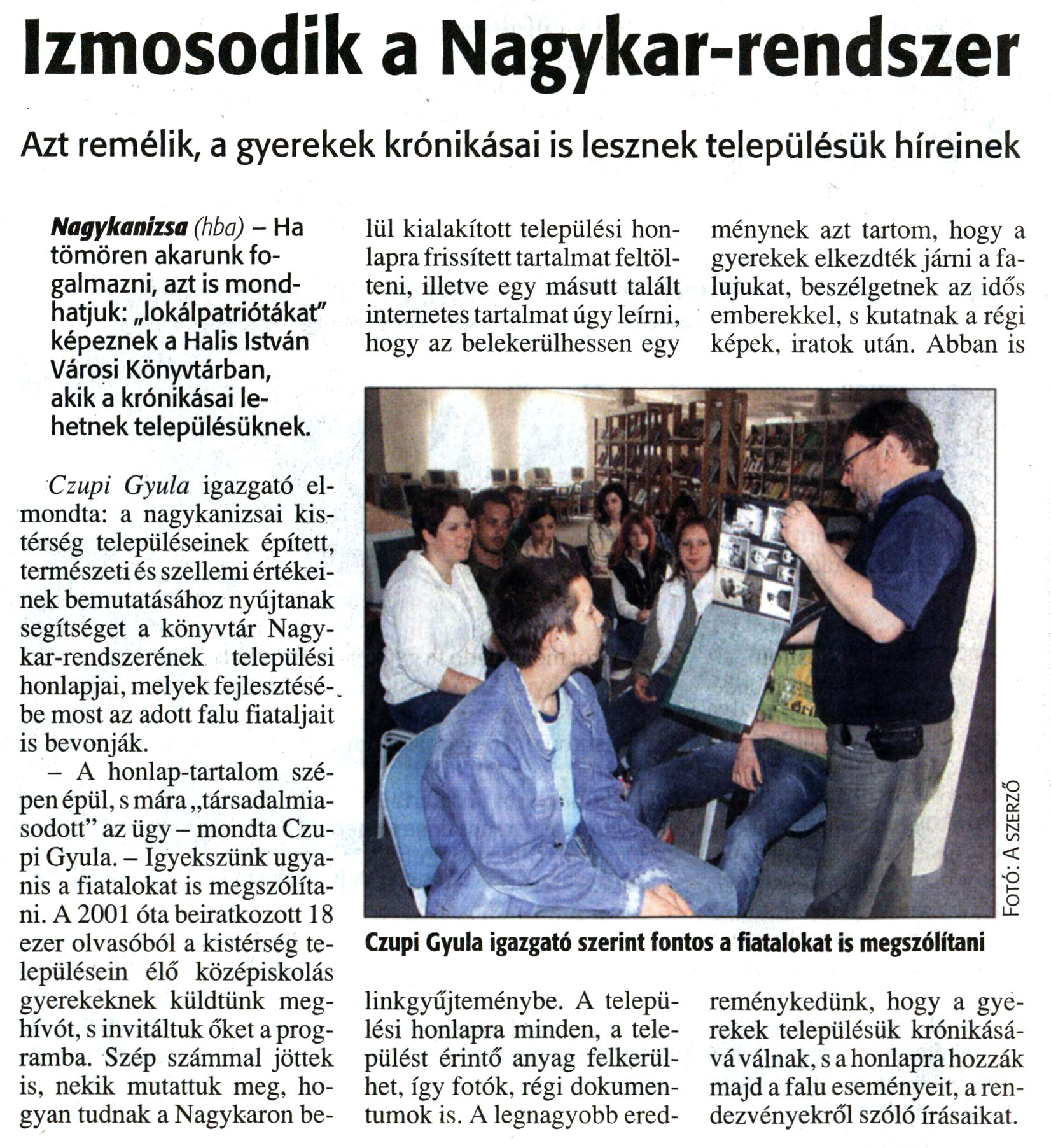 Nyilvános 14307 | 28548 | Zalai Hírlap 2008. június 9. 133. szám 12. oldal - Izmosodik a Nagykar-rendszer | A cikk szövege: Izmosodik a Nagykar-rendszer Azt remélik, a gyerekek krónikásai is lesznek településük híreinek Nagykanizsa (hba) - Ha tömören akarunk fogalmazni, azt is mondhatjuk: „lokálpatriótákat" képeznek a Halis István Városi Könyvtárban, akik a krónikásai lehetnek településüknek. Czupi Gyula igazgató elmondta: a nagykanizsai kistérség településeinek épített, természeti és szellemi értékeinek bemutatásához nyújtanak segítséget a könyvtár Nagykar-rendszerének települési honlapjai, melyek fejlesztésébe most az adott falu fiataljait is bevonják. - A honlap-tartalom szépen épül, s mára „társadalmiasodott" az ügy - mondta Czupi Gyula. - Igyekszünk ugyanis a fiatalokat is megszólítani. A 2001 óta beiratkozott 18 ezer olvasóból a kistérség településein élő középiskolás gyerekeknek küldtünk meghívót, s invitáltuk őket a programba. Szép számmal jöttek is, nekik mutattuk meg, hogyan tudnak a Nagykaron belül kialakított települési honlapra frissített tartalmat feltölteni, illetve egy másutt talált internetes tartalmat úgy leírni, hogy az belekerülhessen egy linkgyűjteménybe. A települési honlapra minden, a települést érintő anyag felkerülhet, így fotók, régi dokumentumok is. A legnagyobb eredménynek azt tartom, hogy a gyerekek elkezdték járni a falujukat, beszélgetnek az idős emberekkel, s kutatnak a régi képek, iratok után. Abban is reménykedünk, hogy a gyerekek településük krónikásává válnak, s a honlapra hozzák majd a falu eseményeit, a rendezvényekről szóló írásaikat. Képaláírás: Czupi Gyula igazgató szerint fontos a fiatalokat is megszólítani |